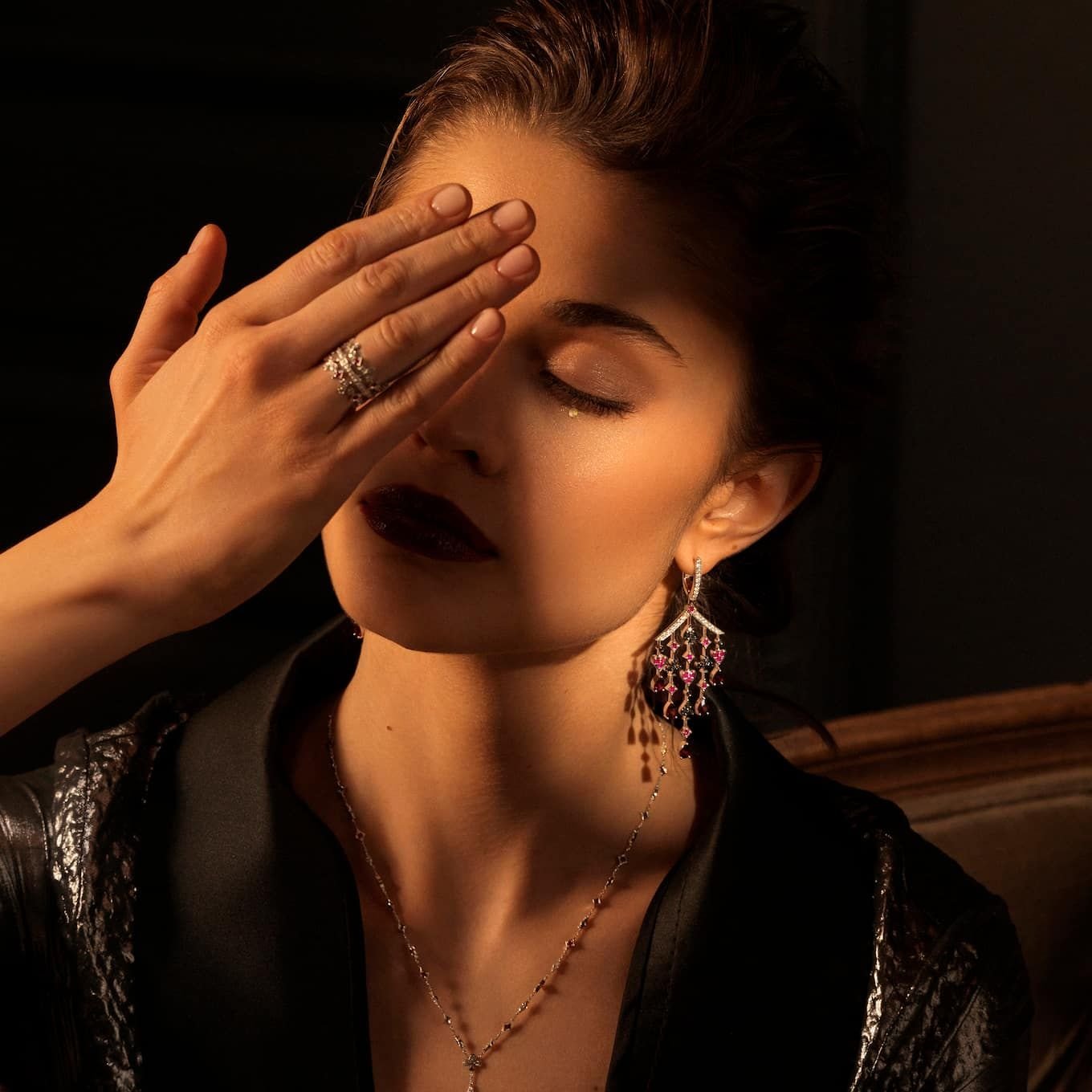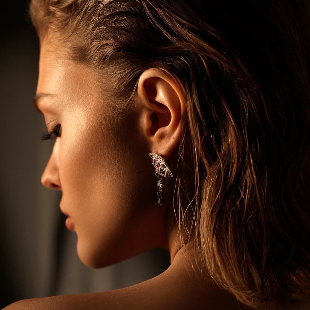 “В эти украшения нам хотелось привнести драматизма и в то же время блеска, главное воплощение которых – хедлайнер коллекции, брошь “Пиковая дама”.Мы также включили в коллекцию яркиесерьги-трансформеры и кольцо, которое можно назвать ювелирной цитатой решающего момента повести, когда вместо туза главному герою Германну выпадает пиковая дама”.