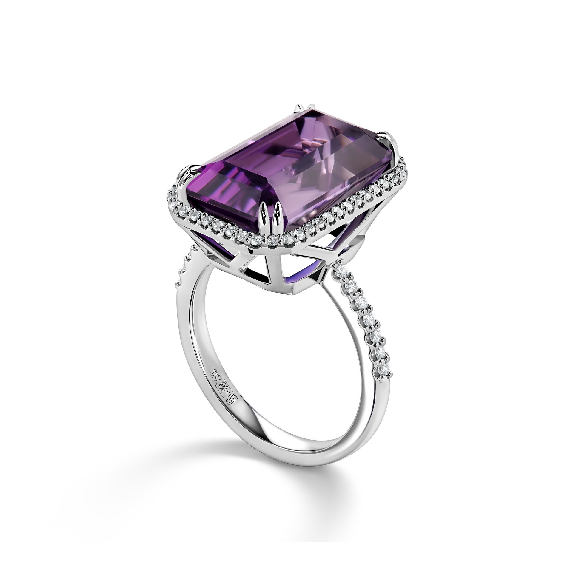 Дополнительным акцентом служат бриллианты общей массой 0.312 карата с круглой огранкой, украшающие ободок и основу кольца. Они создают элегантный блеск, подчёркивая насыщенность цвета аметиста и добавляя изделию особый шарм.