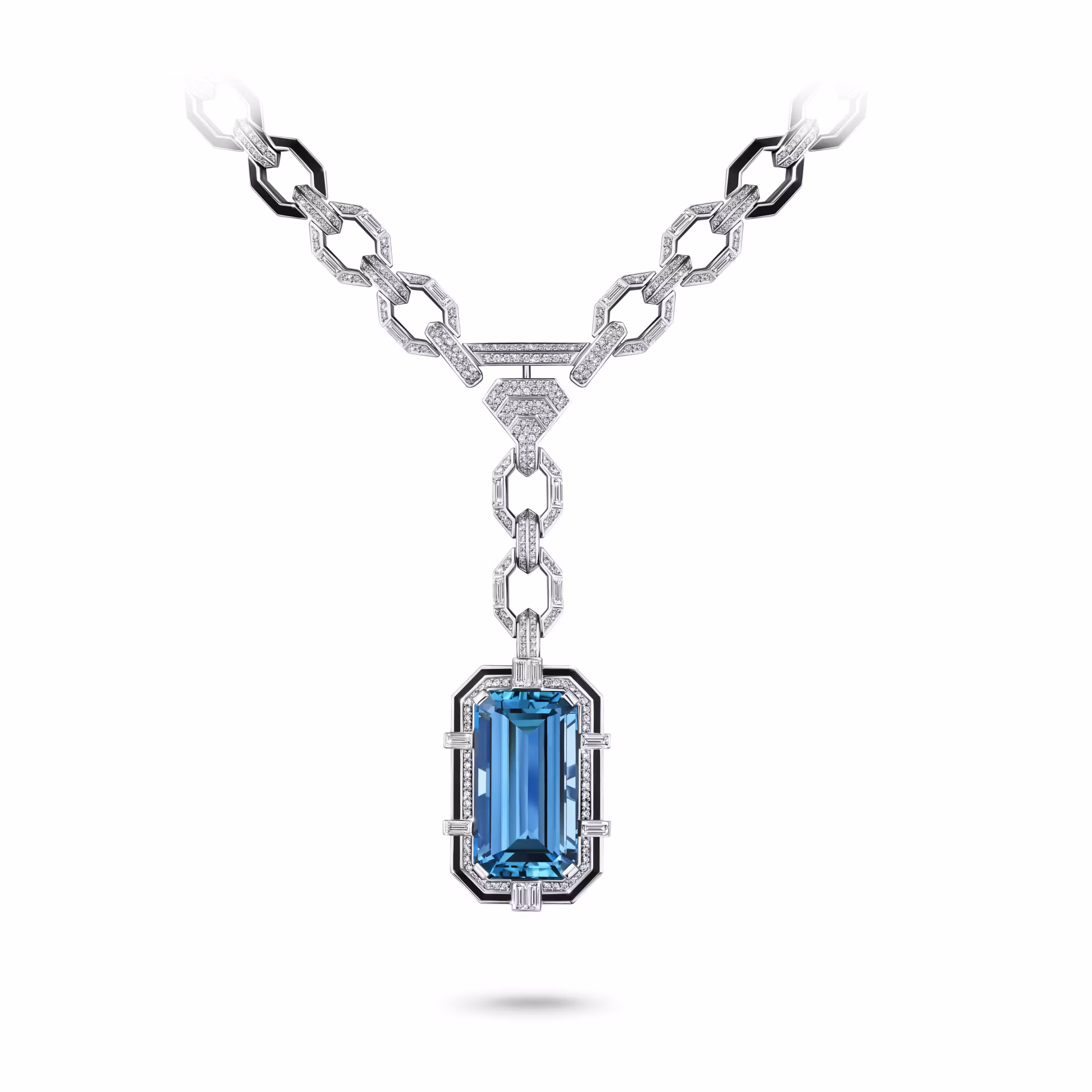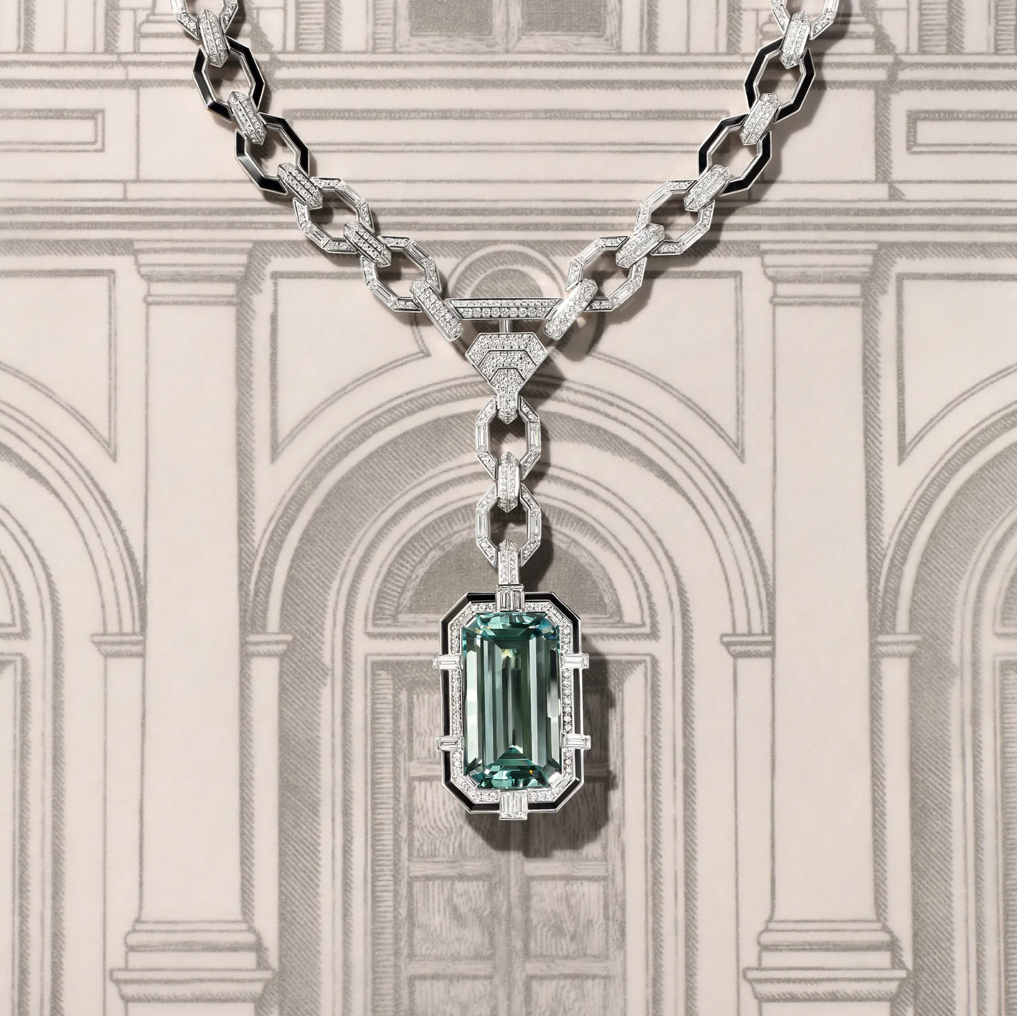 Геометричный стиль колье навеян архитектурными мотивами картины «Парижские мосты» Ришара Жераняна. Звенья из белого золота инкрустированы бриллиантами и переплетаются с акцентами из чёрной ювелирной эмали. Все детали подчёркивают аквамарин ступенчатой огранки.