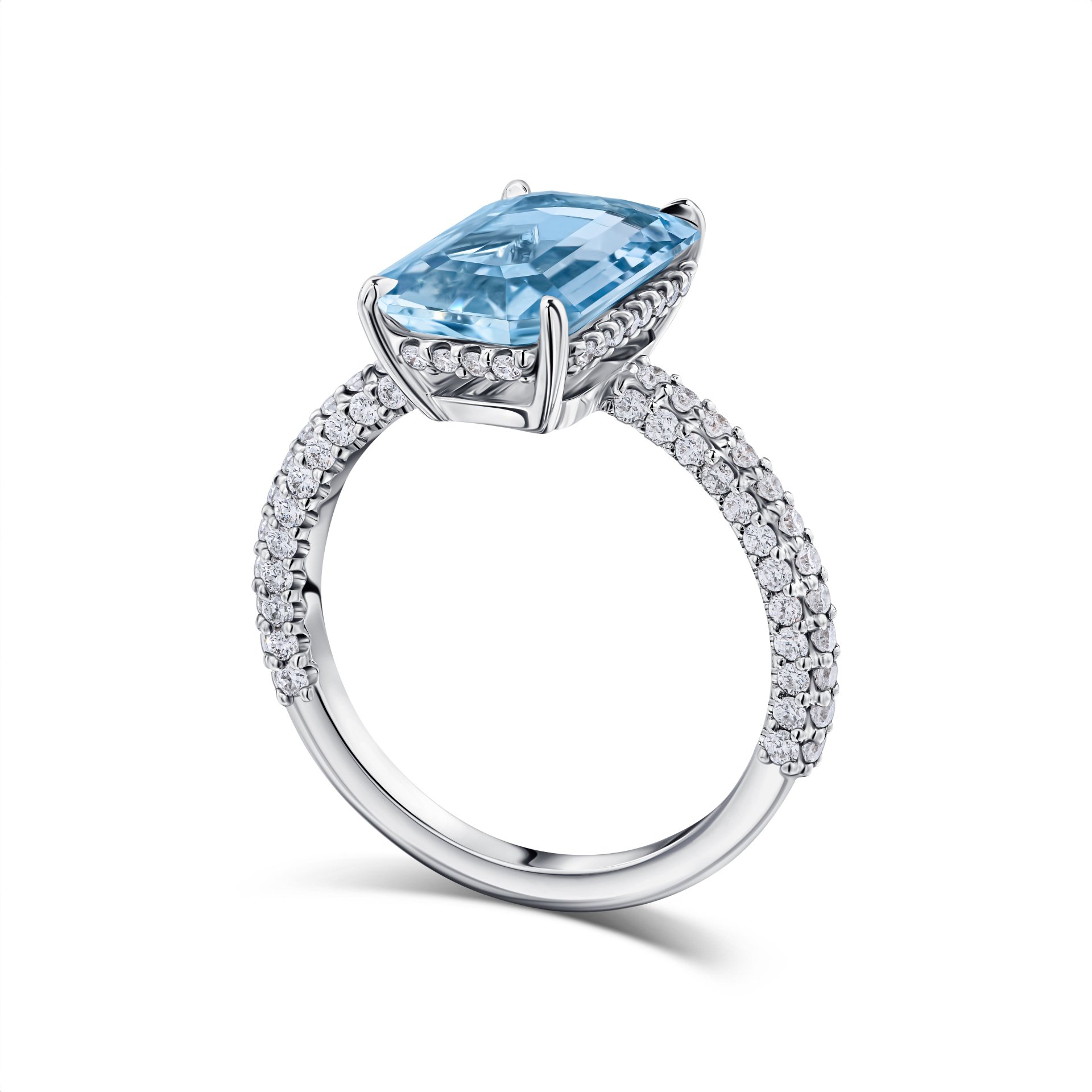 Погрузитесь в мир изысканности с кольцом, где главный акцент сделан на завораживающем аквамарине весом 2.51 карат. Его чистый голубой цвет напоминает о спокойствии морских глубин, привнося в образ нотки свежести и утонченности. Камень, ограненный в элегантной форме, обрамлен сияющими бриллиантами общим весом около 0.572 карата, которые добавляют композиции блеск и изящество.