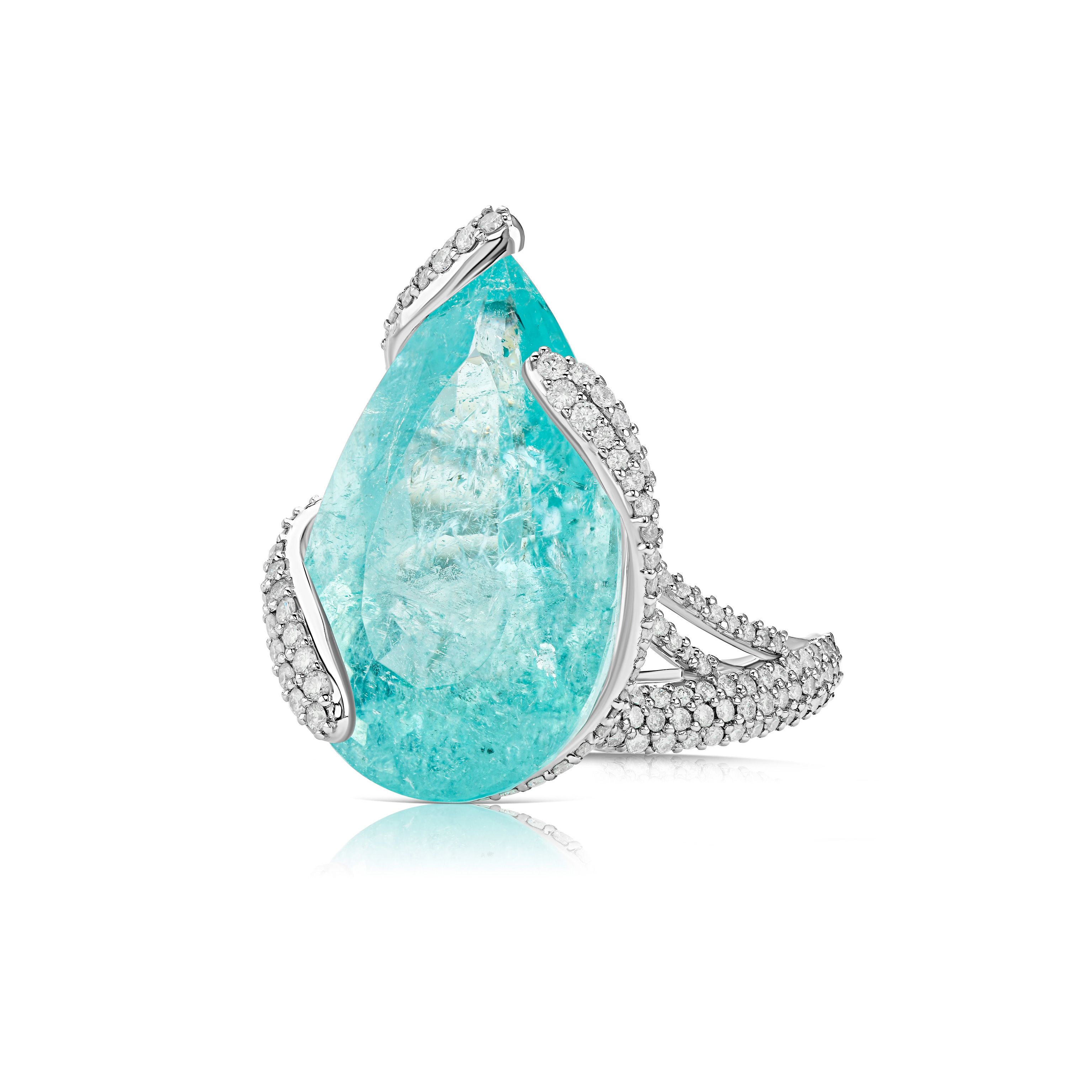 Артикул: R2805Турмалин Параиба весом 20.43 карата становится центральной деталью кольца «Blessing of the Ocean». Его глубокий бирюзовый оттенок напоминает морскую гладь, создавая эффект живой воды. Камень огранен в форму капли, что подчеркивает его естественную красоту и прозрачность. Обрамление выполнено из белого золота, плавно обвивающего турмалин и украшенного множеством мелких бриллиантов, которые добавляют изделию легкое мерцание и визуальный объем. Такая конструкция не только фиксирует камень надежно, но и придает кольцу изящность и современный стиль.