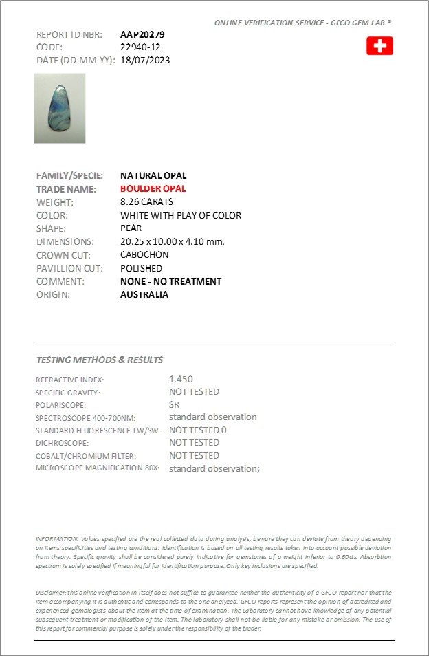 Опал весом 8.26 карата привлекает внимание своей необычной формой и выразительной игрой цвета. Камень демонстрирует плавные переходы от глубоких синих оттенков к нежным зеленовато-голубым тонам, создавая эффект мягких волн и переливов. Такая природная палитра делает изделие по-настоящему неповторимым и интересным с точки зрения дизайна.