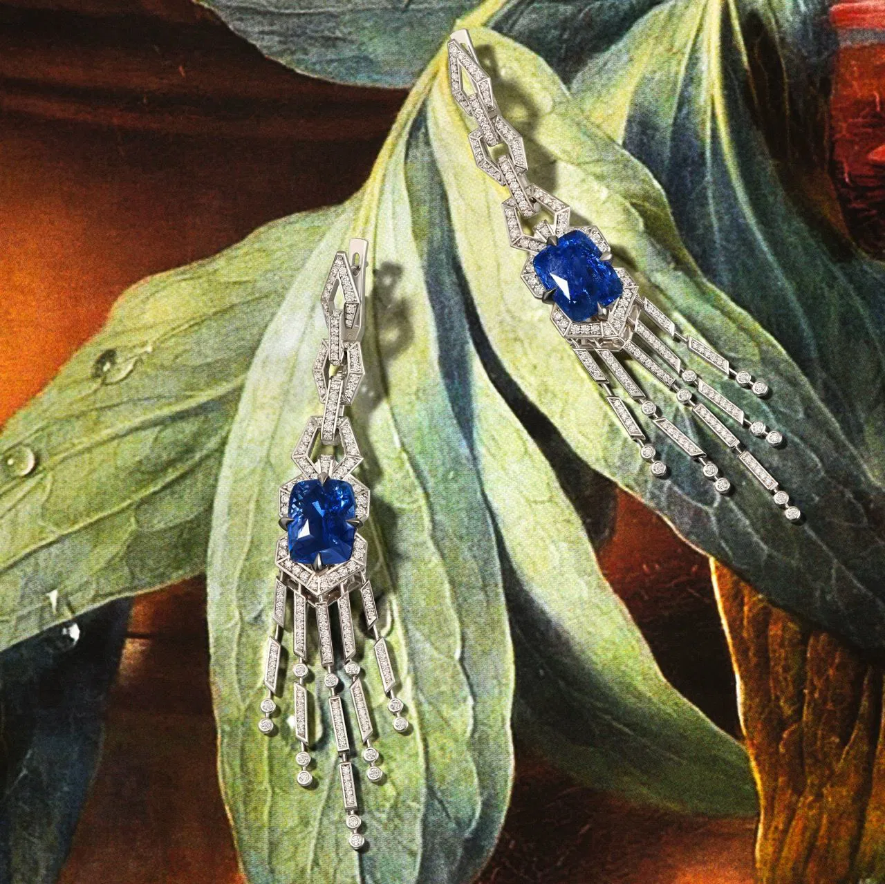 Геометрические элементы дизайна создают впечатление динамики и движения, напоминая архитектурные линии знаменитого Бродвея. Искусно инкрустированные бриллианты добавляют сияние и подчёркивают благородство сапфиров, делая серьги идеальным дополнением к вечернему наряду.