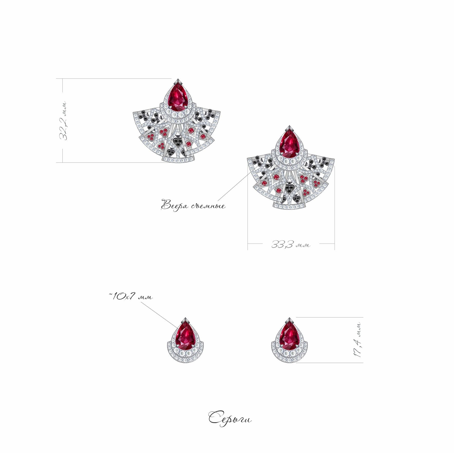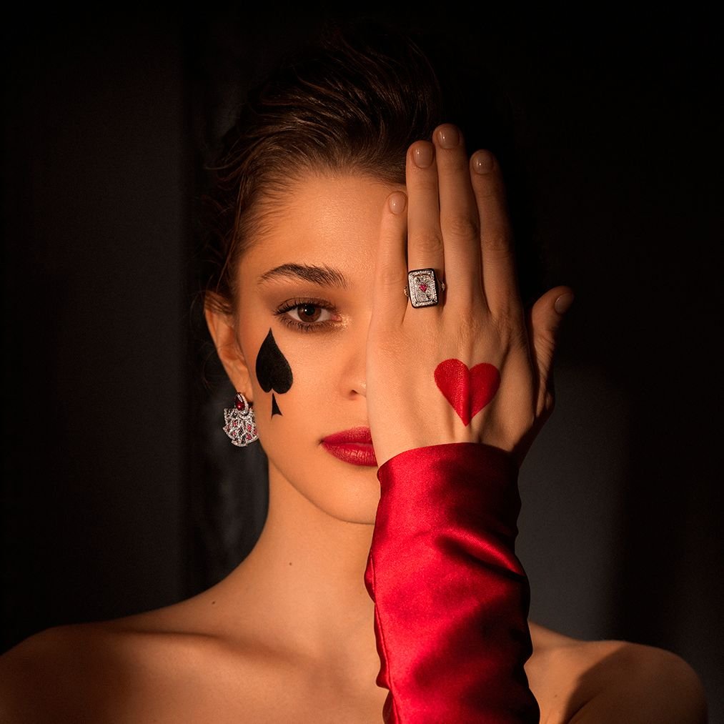Серьги «Карты в руки» — это воплощение артистизма и элегантности, созданное для тех, кто ценит уникальные детали. Центральное место в дизайне занимают грациозные капли рубеллита, обрамленные белым золотом, которое придает украшению особый блеск. Гранаты и бриллианты весом 4.04 карата добавляют игре света и цвета, создавая эффектный контраст и привлекая внимание.