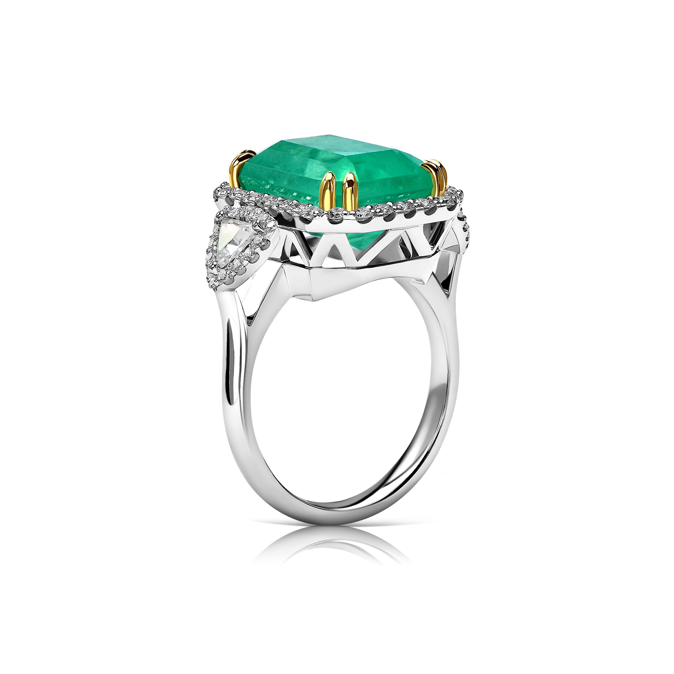 Изумруд, весом 6.99 карата, становится сердцем этого великолепного украшения, словно озаряя его внутренним светом. Его насыщенный зелёный оттенок подчёркивает изысканность и природную красоту камня. Центральный изумруд окружён россыпью бриллиантов, которые создают эффект сияния и глубины, усиливая впечатление от главного камня.