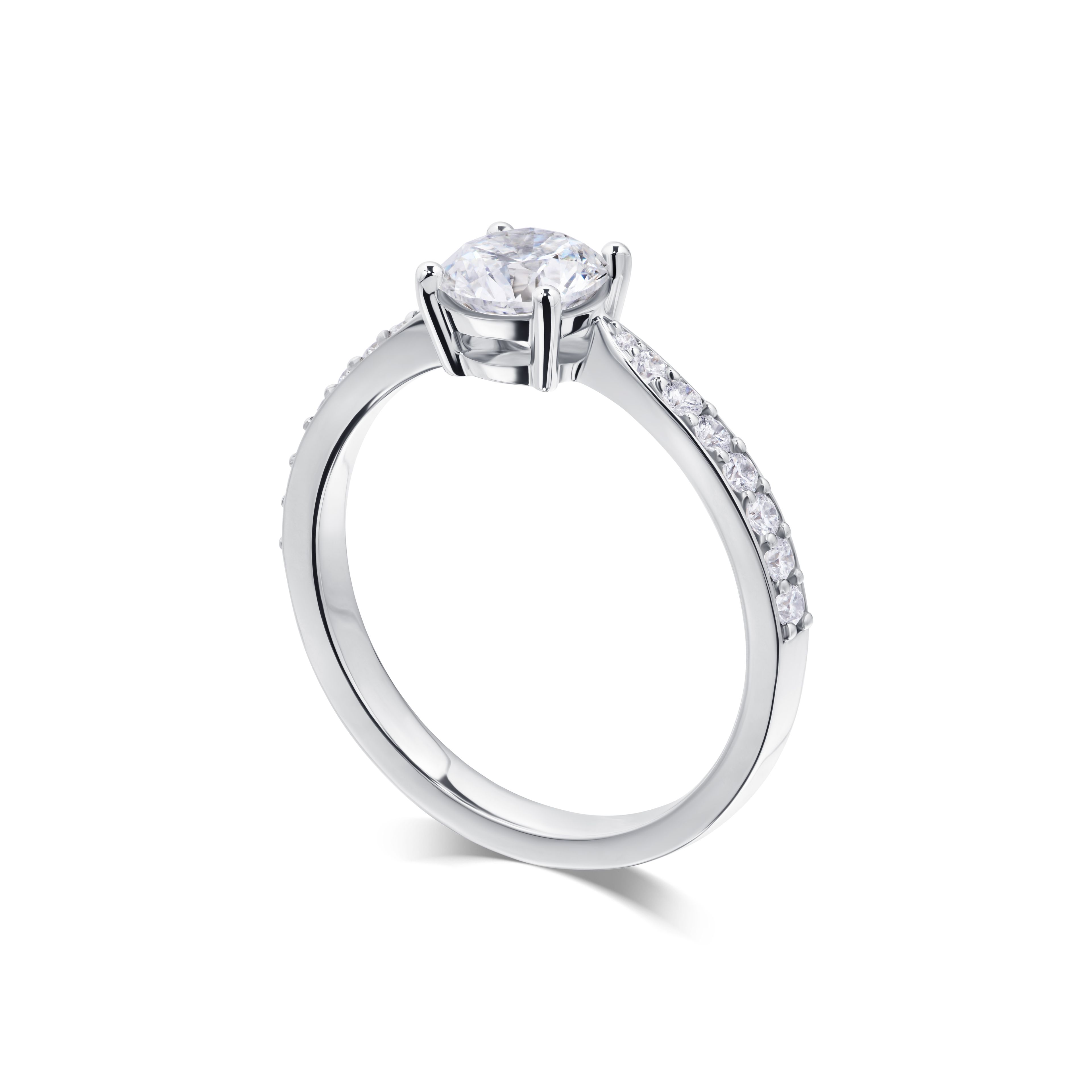 Использование высококачественного белого золота придает кольцу современный и утончённый вид. Центральный бриллиант станет настоящим символом вашей любви, а боковые камни добавляют мягкое сияние, подчеркивая безупречность формы. Это кольцо станет прекрасным выбором для особенных моментов жизни.
