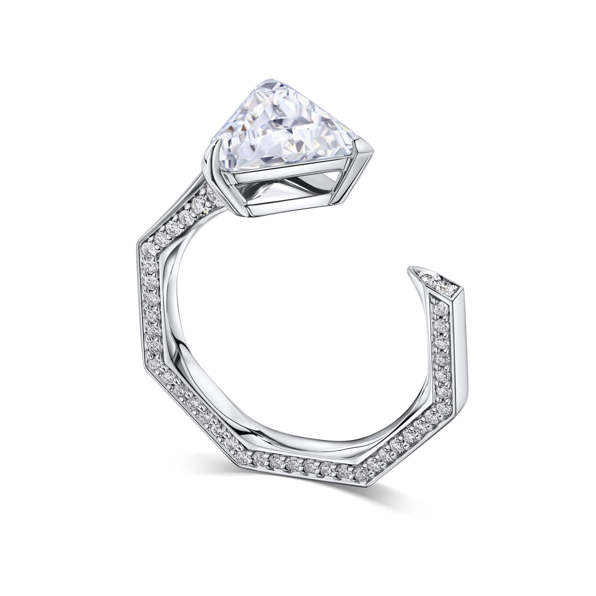 Белое золото, использованное в этом кольце, придает ему современный и стильный вид, идеально сочетающийся с блеском бриллиантов. Это украшение от Ювелирной дизайн-студии Parure Atelier станет идеальным выбором для тех, кто ценит роскошь и индивидуальность.