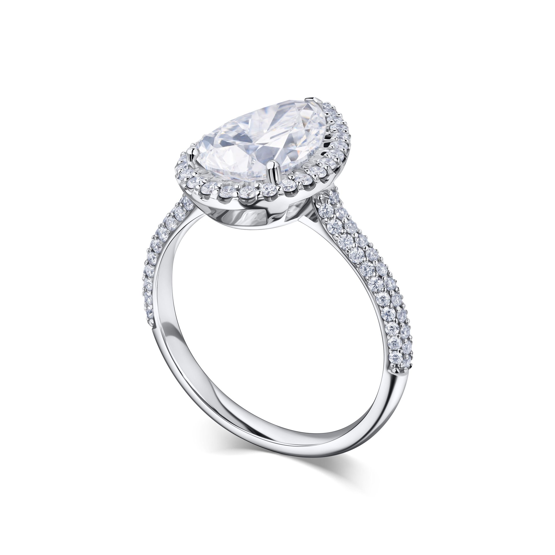 Великолепие и изящество слились в этом кольце, где центральный бриллиант весом 2.50 карата привлекает внимание своим сиянием. Его грушевидная огранка создает неповторимую игру света, подчёркивая каждую грань. Белое золото обрамляет камень, добавляя элегантности и современности.