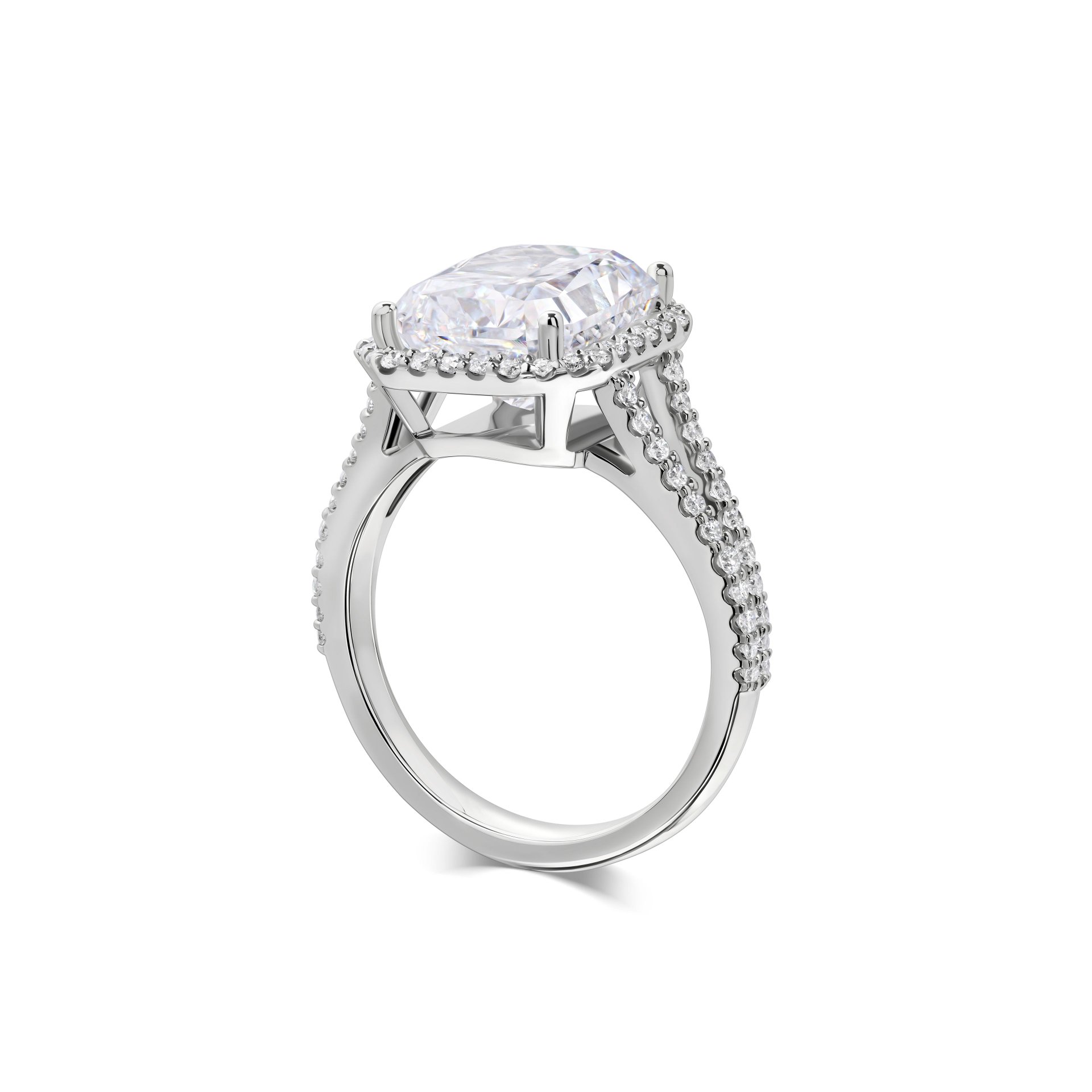 Великолепие и элегантность слились воедино в этом кольце, где центральный бриллиант весом 5.06 карата сияет ярким светом. Его изысканная огранка привлекает внимание, создавая игру света и тени. Боковые бриллианты, ограненные в форме трапеции и общей массой около 0.477 карата, добавляют композиции утонченности и глубины. Белое золото обрамляет камни, подчеркивая их чистоту и блеск.