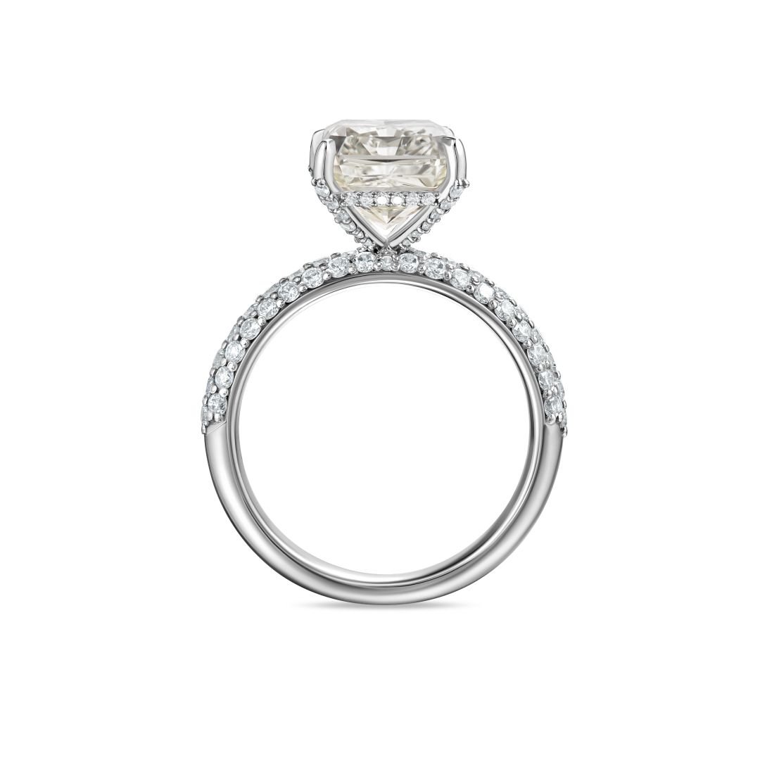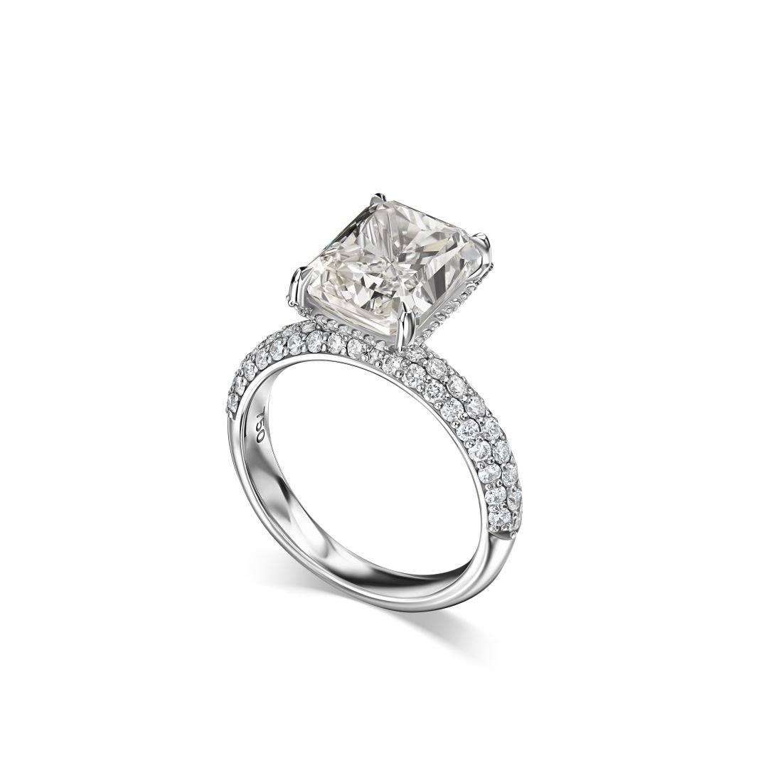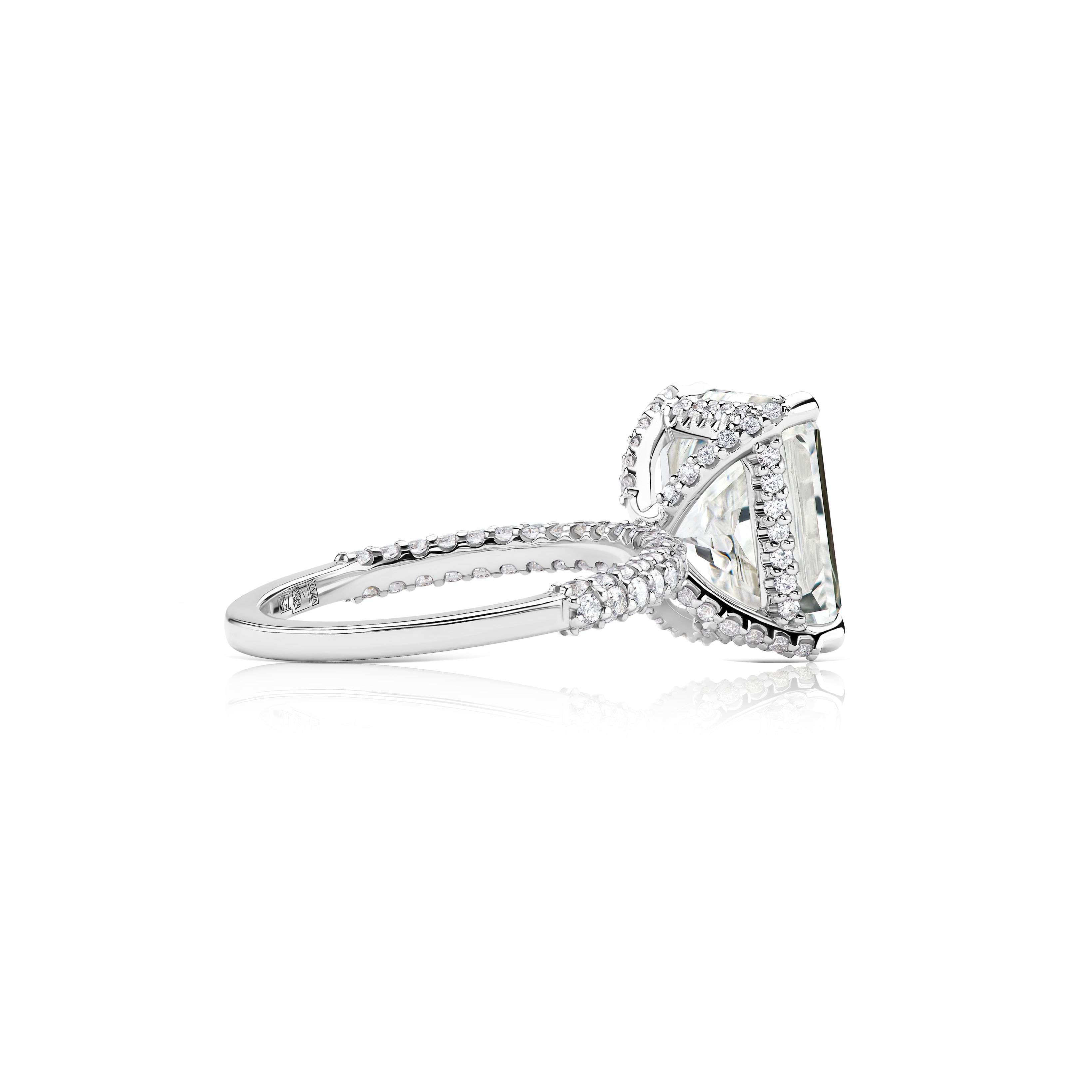 Обрамление из белого золота добавляет кольцу современный и стильный вид, идеально сочетающийся с центральным камнем. Боковые бриллианты, общей массой около 0.9 карата, расположенные в изящной круглой огранке, усиливают сияние и делают композицию завершенной и гармоничной.