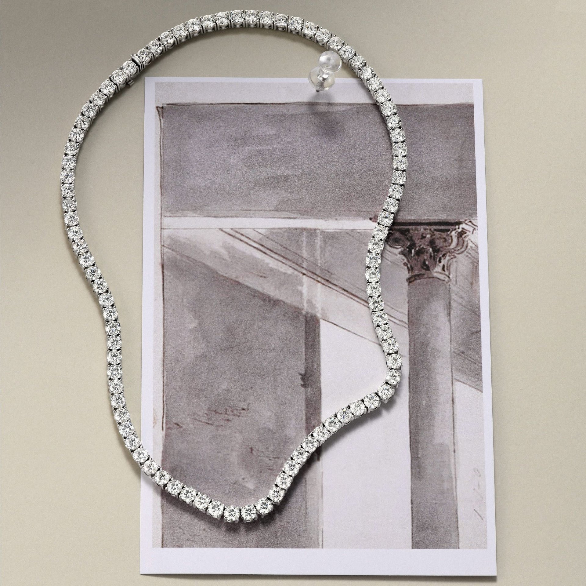 Минималистичный стиль делает колье универсальным: оно гармонично дополняет как торжественные, так и повседневные образы. Белое золото придаёт украшению сдержанный, но эффектный вид, подчеркивая чистоту камней.