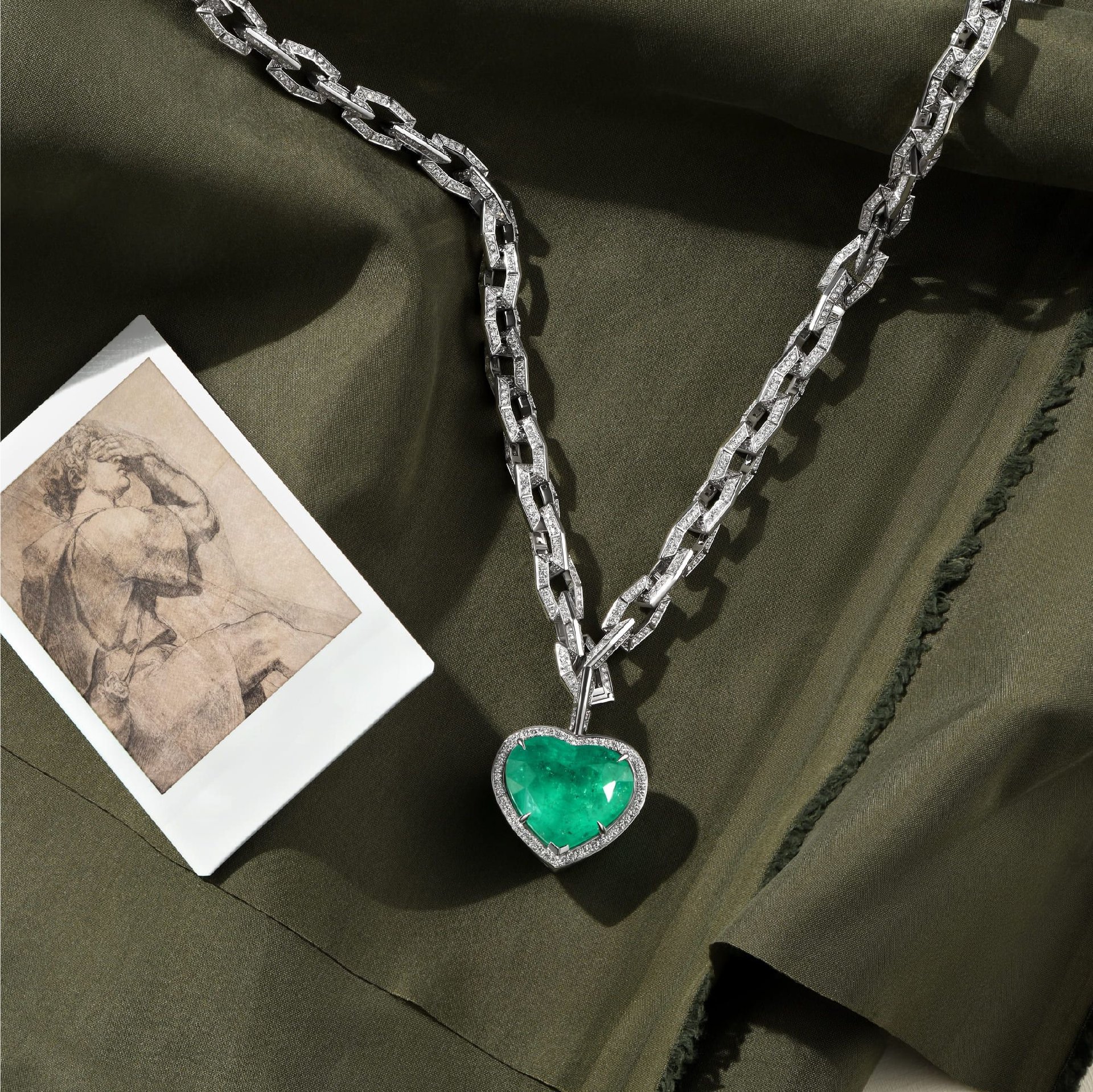 Колье-трансформер «Любовь» с изумрудом – украшение с выразительным дизайном и высоким ювелирным мастерством. Центральный элемент – изумруд весом 31.87 карат, выполненный в огранке сердце. Его насыщенный зелёный оттенок подчёркивает сияющая бриллиантовая инкрустация.