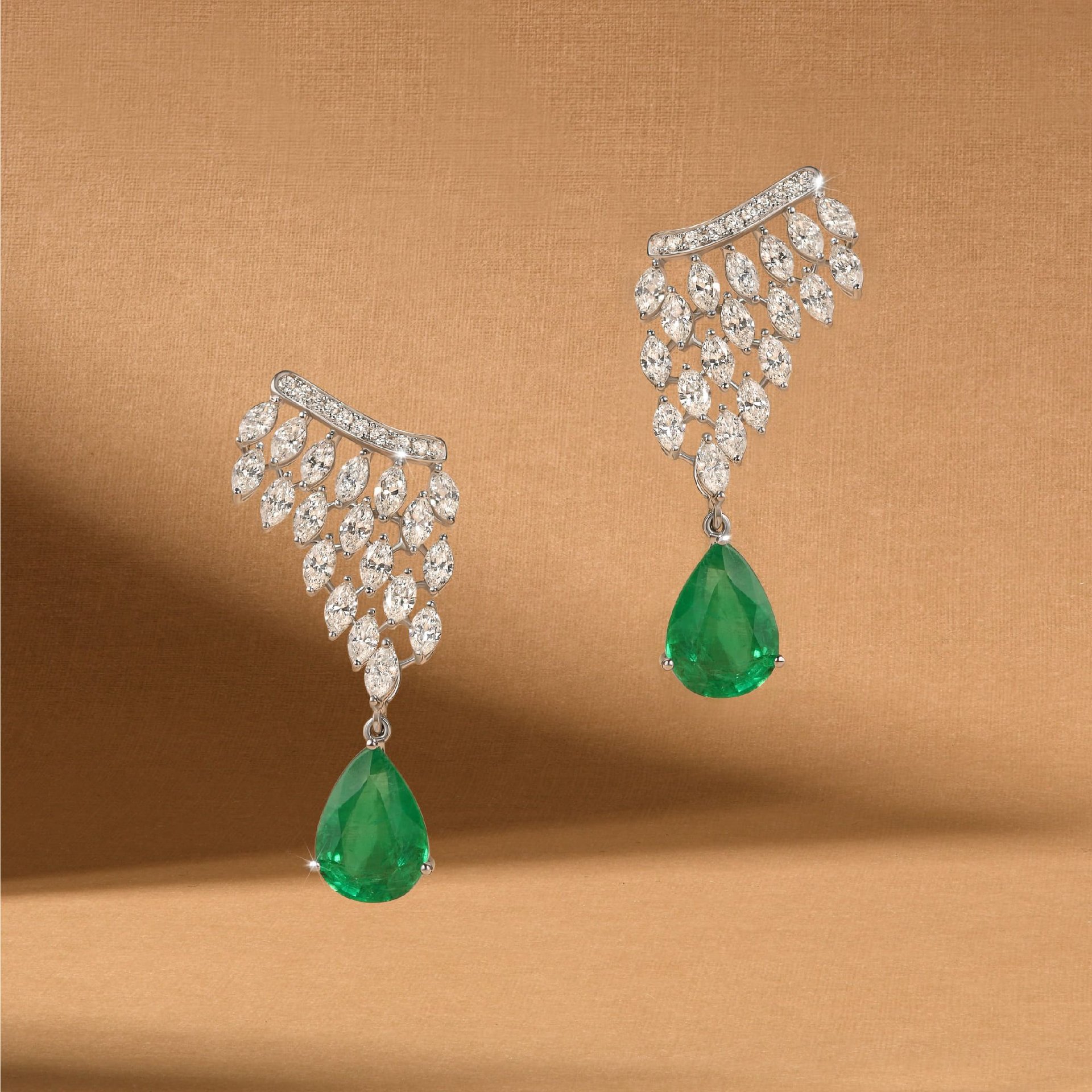 Белое золото подчёркивает блеск изумрудов, создавая гармоничный контраст с россыпью бриллиантов, которые обрамляют верхнюю часть серёг. Множественные бриллианты, расположенные в форме изящной каскадной композиции, добавляют сияние и подчёркивают изысканность дизайна.