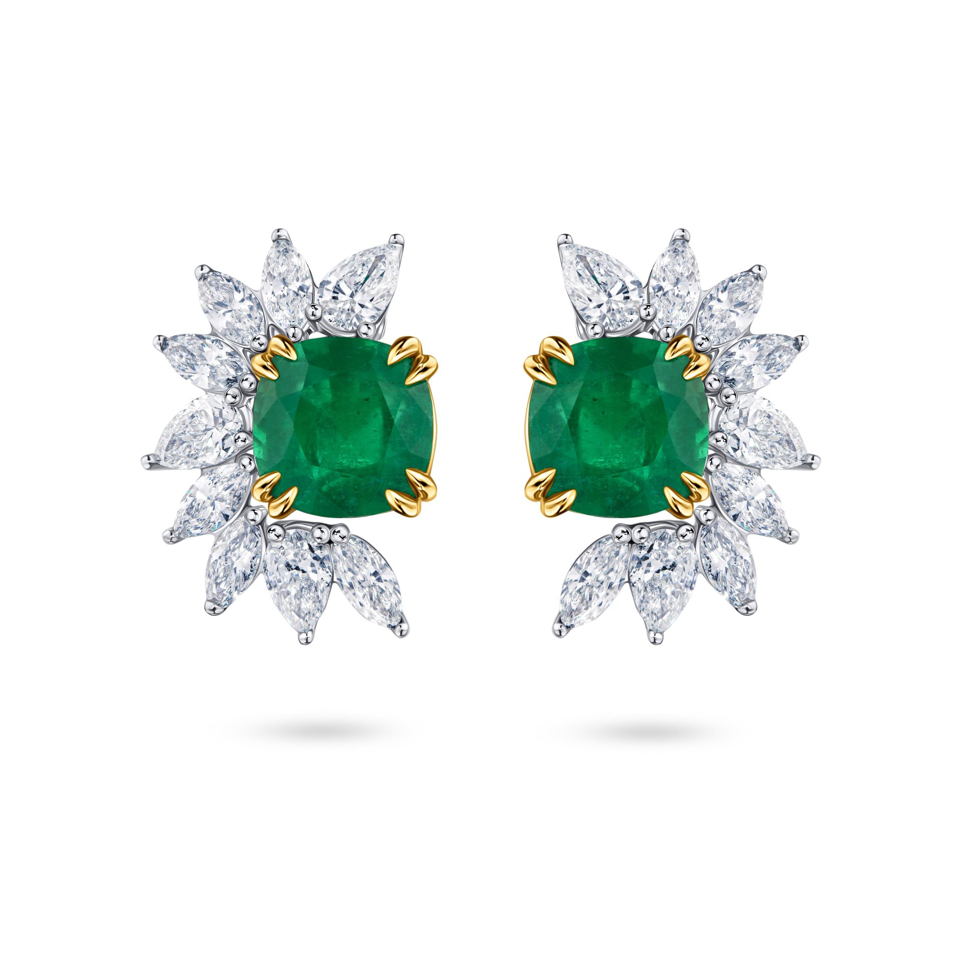Серьги с изумрудами 2.67 карата и 3.34 карата — это истинное воплощение элегантности и утончённости. Центральные изумруды, сверкающие глубокой зеленью, создают восхитительный контраст с блеском белого золота. Каждое изделие обрамлено россыпью бриллиантов грушевидной формы, которые подчёркивают природную красоту изумрудов и добавляют дополнительное сияние.