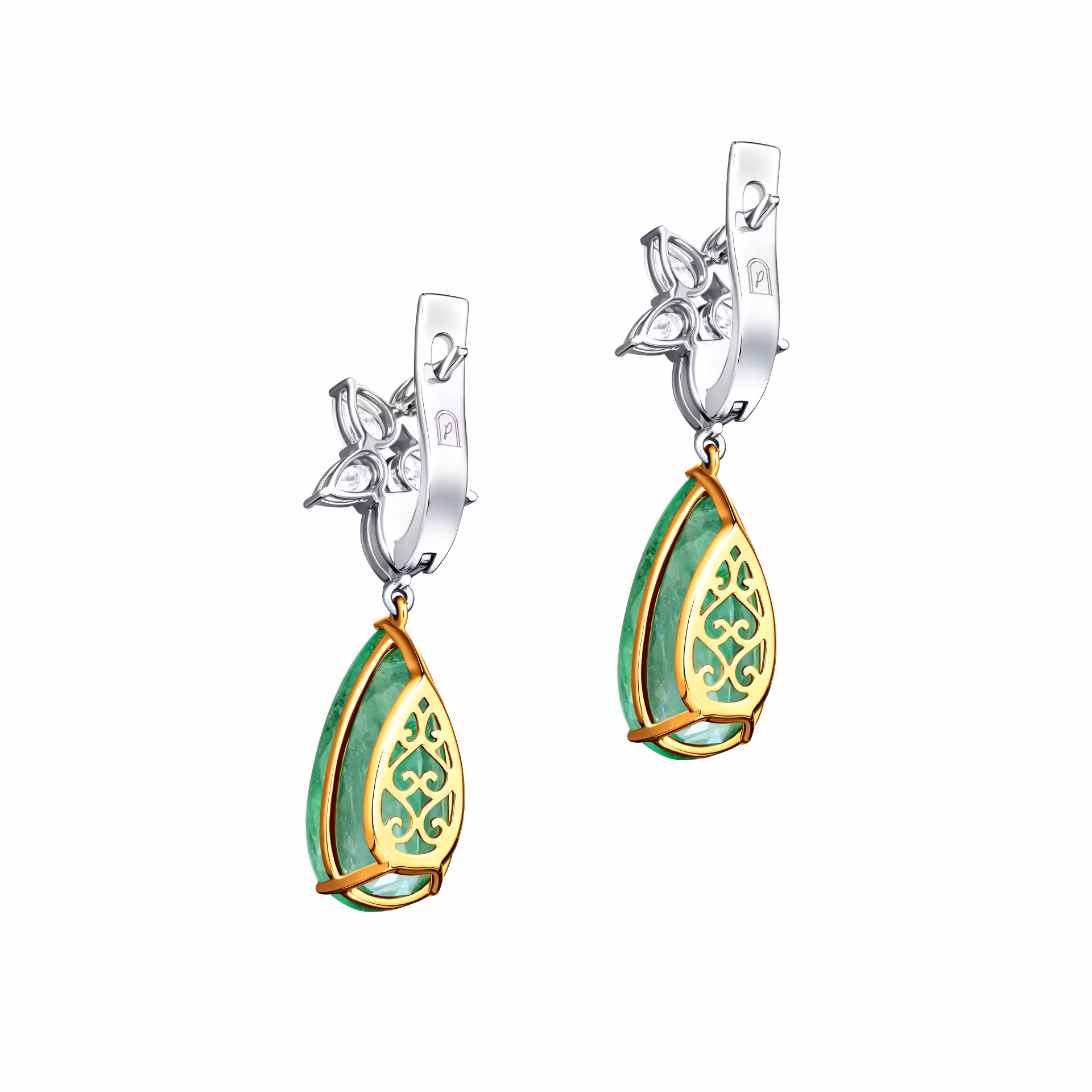 Белое золото, в которое инкрустированы изумруды, добавляет серьгам современный и изысканный вид. Верхняя часть изделия украшена бриллиантами, которые формируют цветочную композицию, добавляя лёгкости и воздушности. Эта деталь придаёт украшению особый шарм, делая его идеальным выбором для особых случаев.