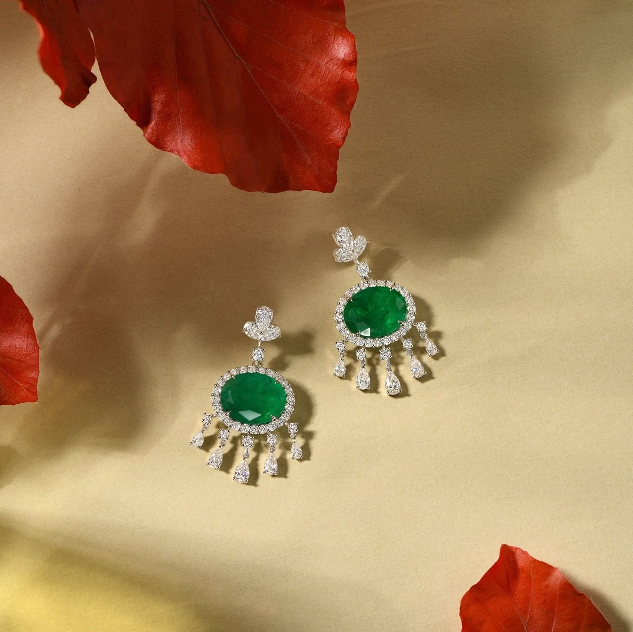 Изысканная огранка изумрудов подчеркнута блеском мелких бриллиантов, которые обрамляют центральные камни, добавляя сияния и глубины композиции. Нежные подвески из бриллиантов придают серьгам динамичность и легкость, создавая эффект мягкого движения при каждом шаге.