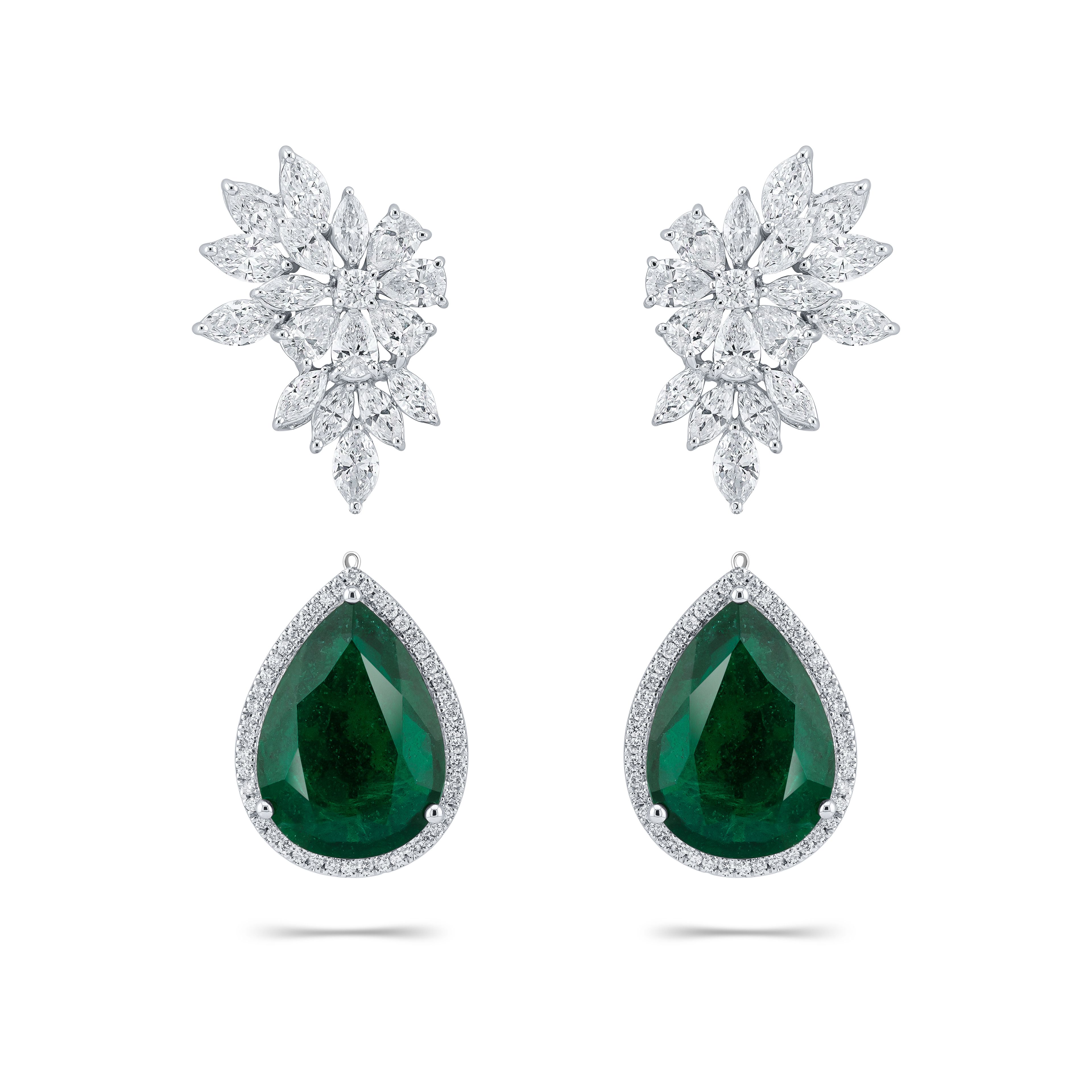 Серьги-трансформеры с изумрудами 7.81 и 8.37 карат — это воплощение утонченной элегантности и утонченного стиля. Центральные изумруды, сверкающие глубоким зеленым цветом, окружены изящной россыпью бриллиантов, которые усиливают их природное сияние. Белое золото создает идеальную основу для этих великолепных камней, добавляя украшению современный и изысканный вид.