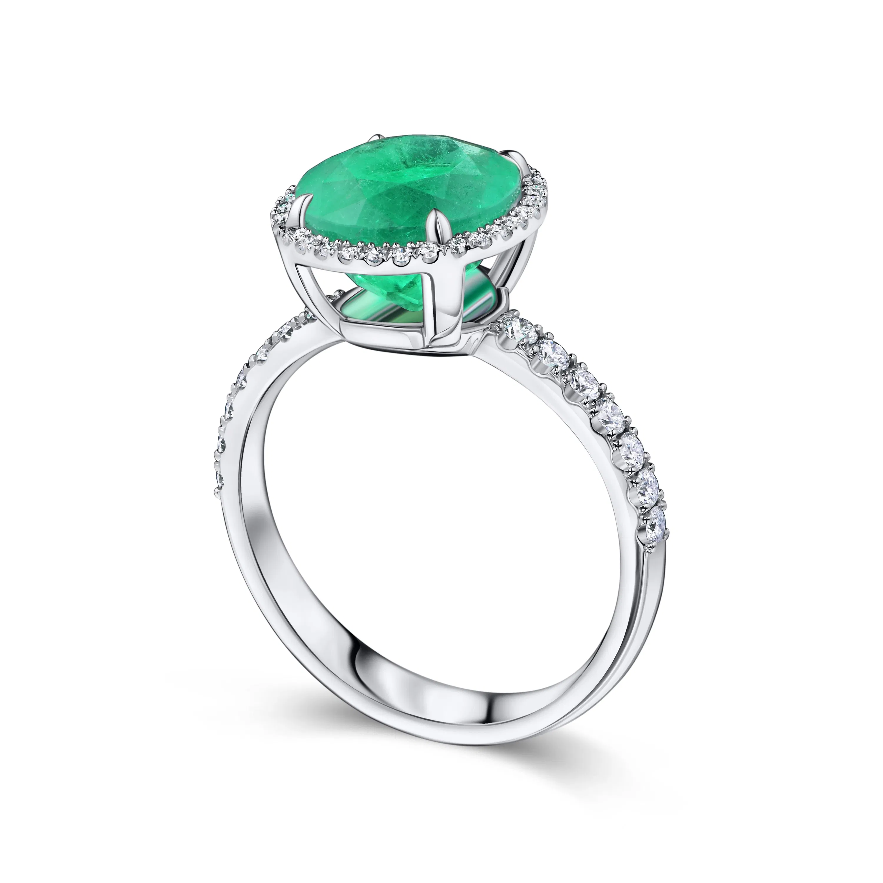 Ободок и часть шинки инкрустированы рядом мелких бриллиантов, создающих эффект сияющего ореола вокруг центрального изумруда и придающих изделию дополнительную выразительность. Белое золото основы гармонично подчёркивает оттенок изумруда и усиливает общую визуальную лёгкость украшения.