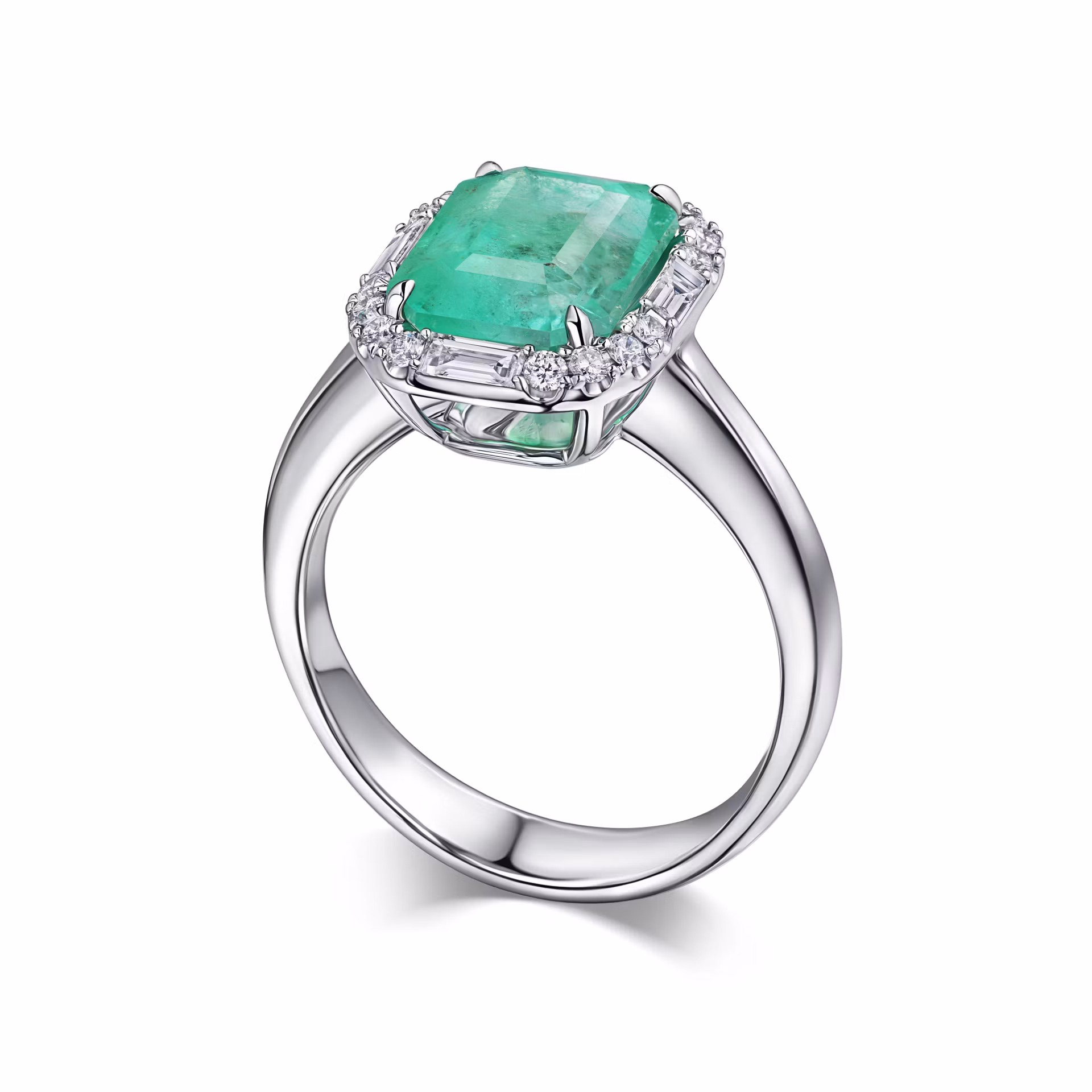 Кольцо с изумрудом 3.47 карата — это воплощение элегантности и утончённого стиля. Центральный изумруд весом 3.47 карата привлекает взгляд своим насыщенным зеленым оттенком, олицетворяя природную красоту и гармонию. Камень окружён изящной оправой из белого золота, которая подчеркивает его блеск и чистоту. Вокруг изумруда расположены сверкающие бриллианты, создающие утончённое сияние и добавляющие изделию особый шарм.