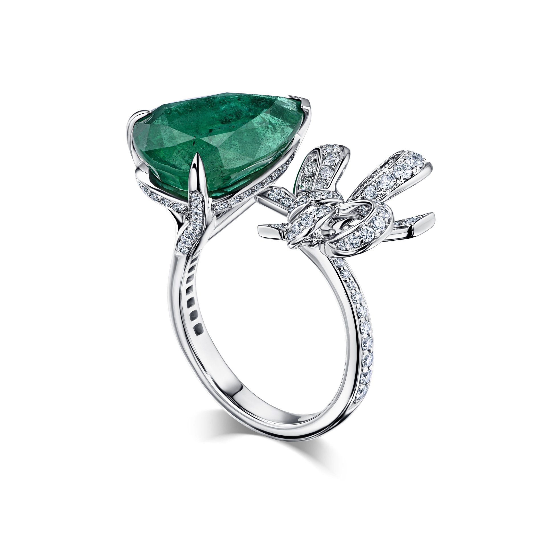 Кольцо с изумрудом 7.16 карат привлекает внимание крупным камнем в форме капли, который занимает центральное место в дизайне. Глубокий зелёный оттенок изумруда подчёркивает изящество изделия, а его вес в 7.16 карата позволяет камню раскрыть всю свою природную красоту и насыщенность цвета. Оригинальная композиция дополнена изящным узором из белого золота, украшенным мелкими бриллиантами, которые мягко обрамляют центральный камень, создавая эффект лёгкости и воздушности.