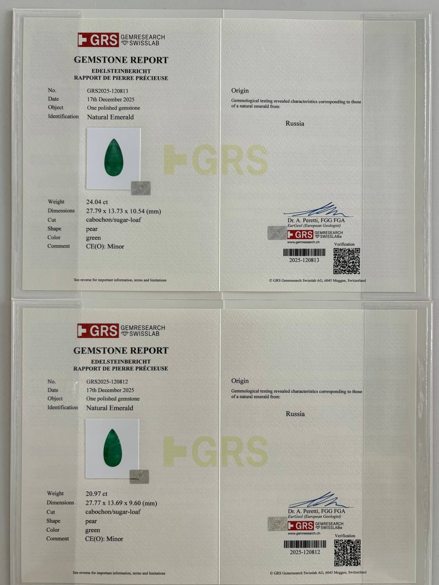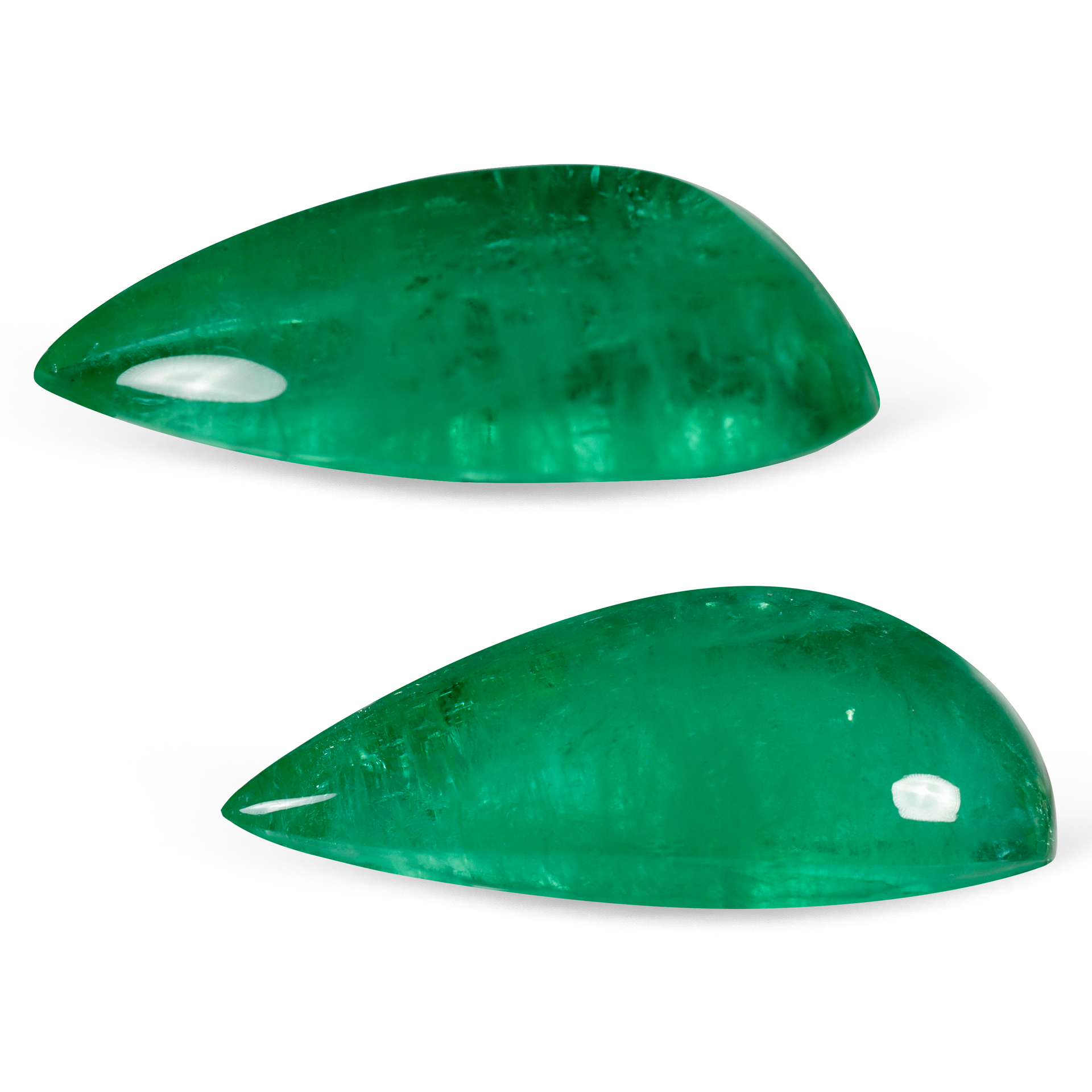 Изумруд весом 24.04 карата привлекает внимание насыщенным зелёным оттенком и каплевидной формой, которая подчёркивает природную красоту камня. Его поверхность обладает лёгкой прозрачностью с характерными внутренними включениями, типичными для уральских изумрудов, что придаёт изделию аутентичность и уникальность. Вторая часть пары — изумруд весом 20.97 карата — гармонично дополняет первый камень, сохраняя общую цветовую гамму и форму, что делает комплект цельным и выразительным.