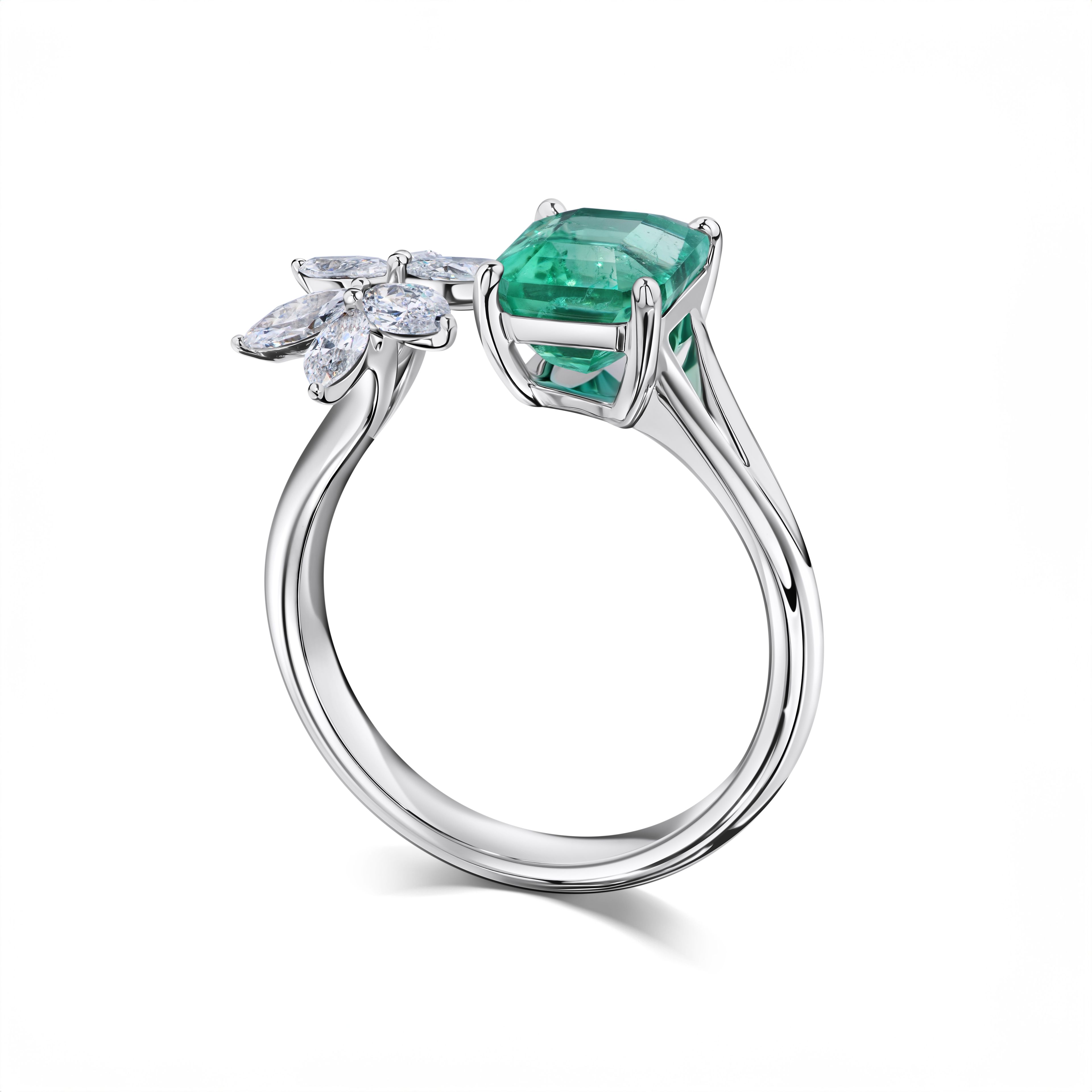 Великолепное кольцо из белого золота, созданное для тех, кто ценит изысканность и природную красоту. Центральное место в этом украшении занимает изумруд весом 1.66 карата, который притягивает взгляд своей насыщенной зеленью. Его обрамляют бриллианты огранки маркиз, общий вес которых составляет около 0.442 карата. Эти сверкающие акценты придают кольцу особую утонченность и гармонию.