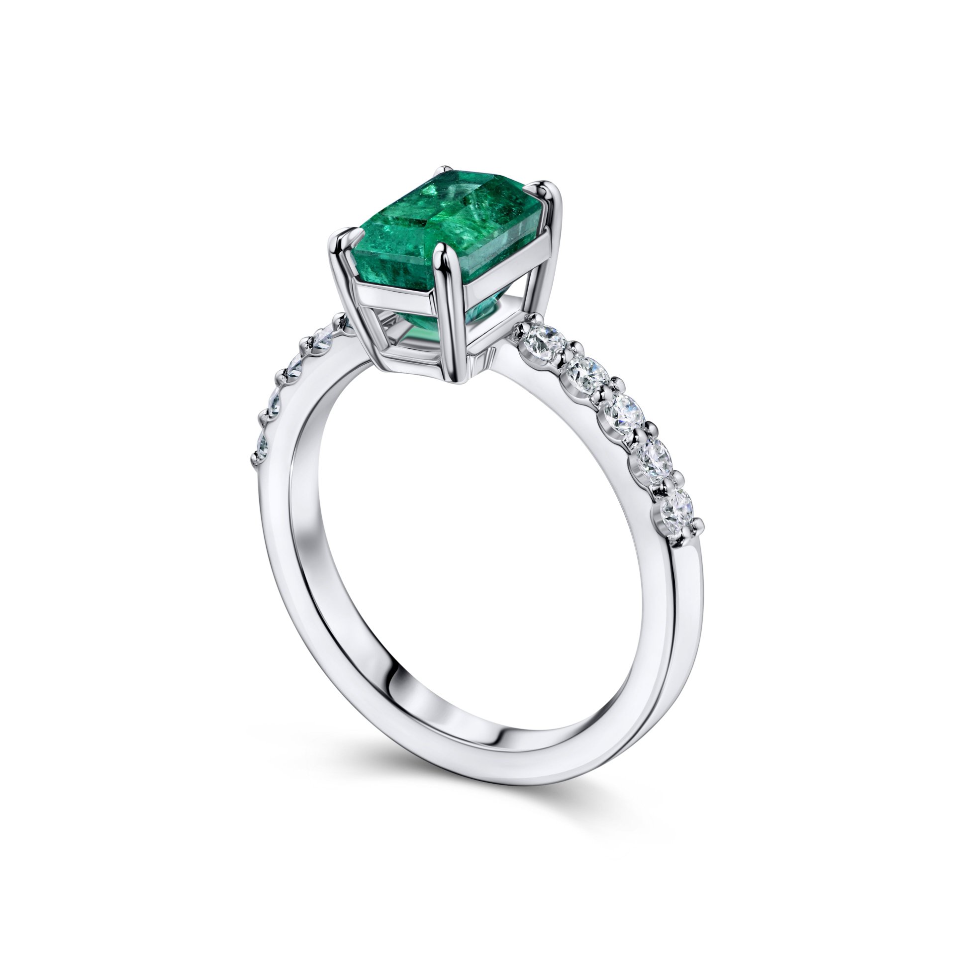 Кольцо с изумрудом 1.90 карат привлекает внимание своей четкой геометрией и насыщенным зеленым оттенком центрального камня. Изумруд весом 1.9 карата аккуратно закреплен на тонком белом золоте, что подчеркивает его естественную красоту и глубину цвета. По обеим сторонам основного камня расположены небольшие бриллианты, которые добавляют изделию дополнительную игру света и изящную детализацию. Лаконичный дизайн позволяет кольцу гармонично сочетаться с разными стилями, оставаясь при этом заметным акцентом.