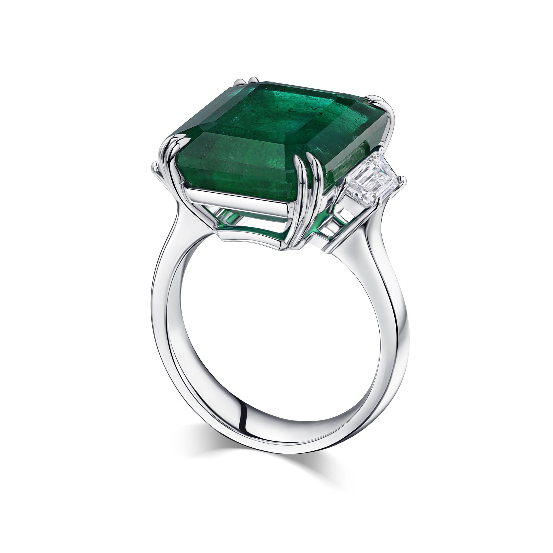 Кольцо с изумрудом 13.28 карат привлекает внимание ярким насыщенным цветом центрального камня. Изумруд весом 13.28 карата обладает выразительной огранкой «октагон», которая подчеркивает глубину и прозрачность камня, создавая эффект живого блеска. По бокам расположены два прямоугольных бриллианта, аккуратно дополняющие композицию и придающие изделию баланс и гармонию. Основа выполнена из белого золота, что усиливает холодные оттенки изумруда и делает образ более сдержанным и универсальным.