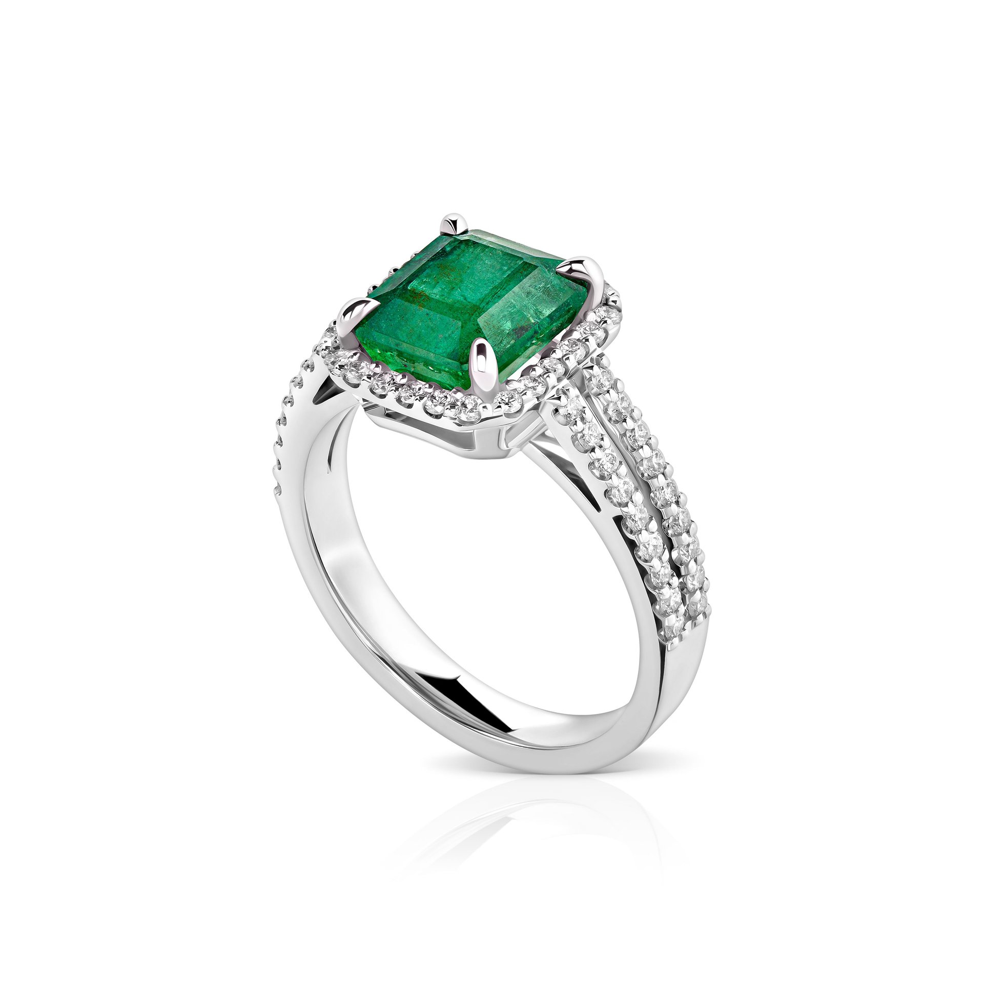 Кольцо с изумрудом 2.36 карат – элегантное украшение, созданное в ювелирной дизайн-студии Parure Atelier. Центральный камень – насыщенный изумруд из Замбии, с огранкой октагон, которая подчёркивает его глубину и блеск. Камень окружён бриллиантами круглой огранки общей массой 0.444 карата. Их сияние создаёт изысканный контраст, подчёркивая природную красоту изумруда.