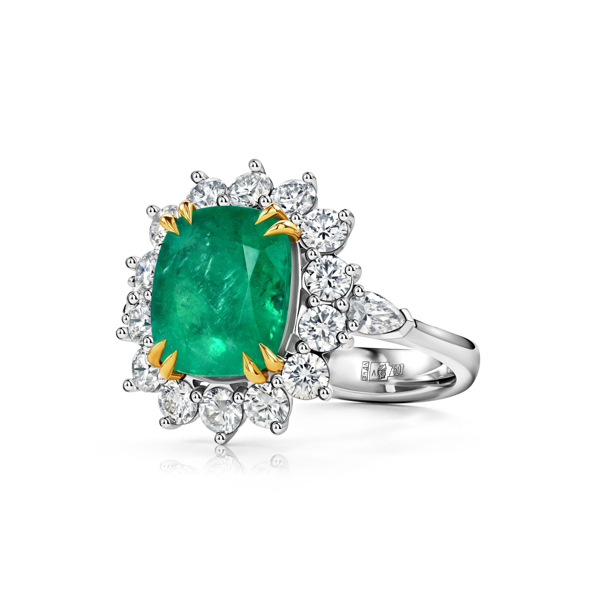 Кольцо с изумрудом от ювелирной дизайн-студии Parure Atelier сочетает изысканную элегантность и мастерство исполнения. Центральный камень – изумруд редкого оттенка Pastel Green, добытый в Колумбии, весом 3.44 карата, огранки кушон. Его природная насыщенность и лёгкая прозрачность подчёркиваются сиянием бриллиантов общей массой 1.289 карат, расположенных вокруг в огранке "груша" и "круг".