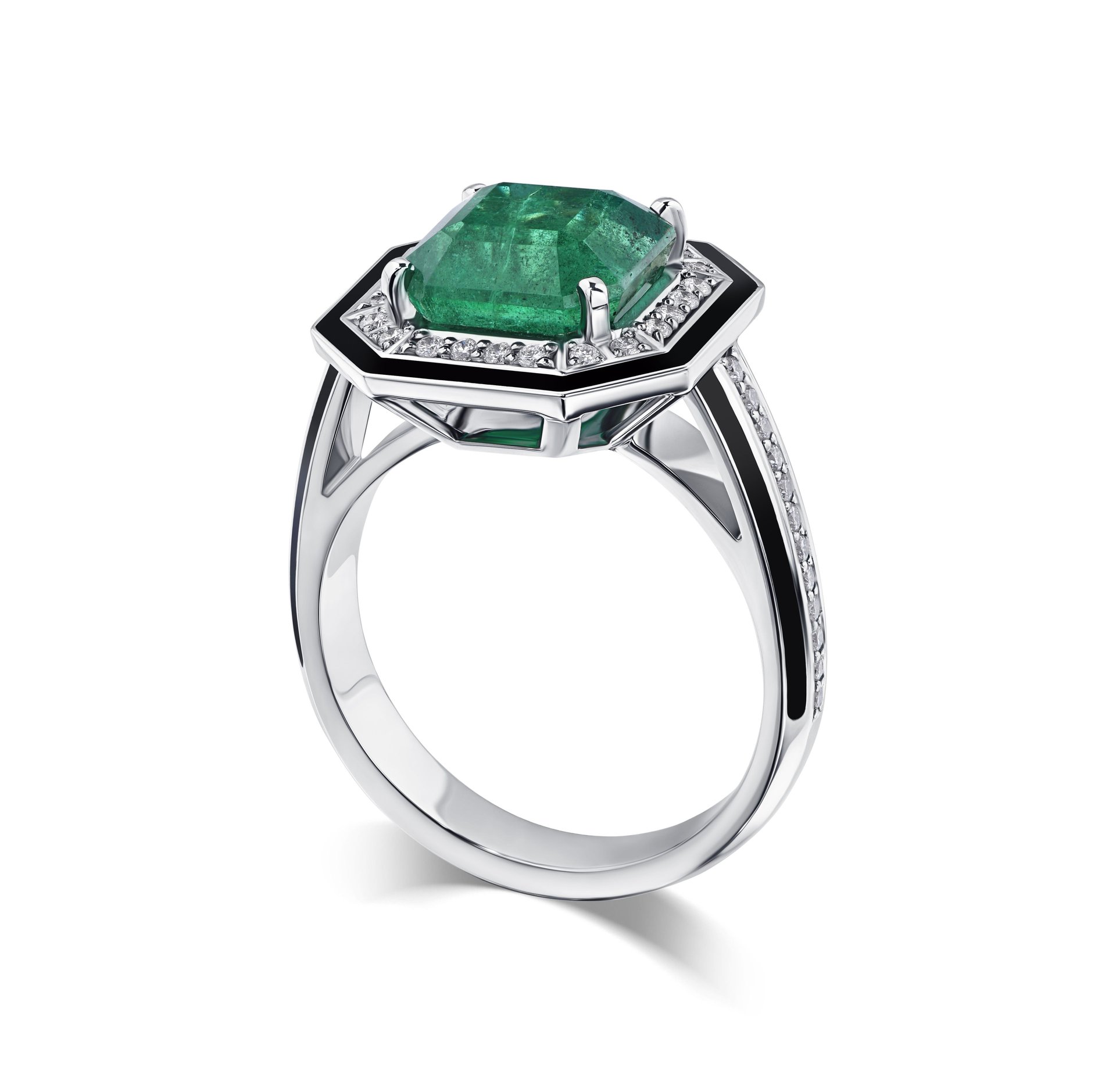 Восхитительное кольцо с изумрудом 3.54 карата — это воплощение элегантности и утонченности. Центральный изумруд, сверкающий глубокими зелеными оттенками, заключен в обрамление из белого золота, создавая гармоничный контраст. Его окружает россыпь бриллиантов общей массой около 0.237 карата, которые добавляют композиции сияние и блеск.