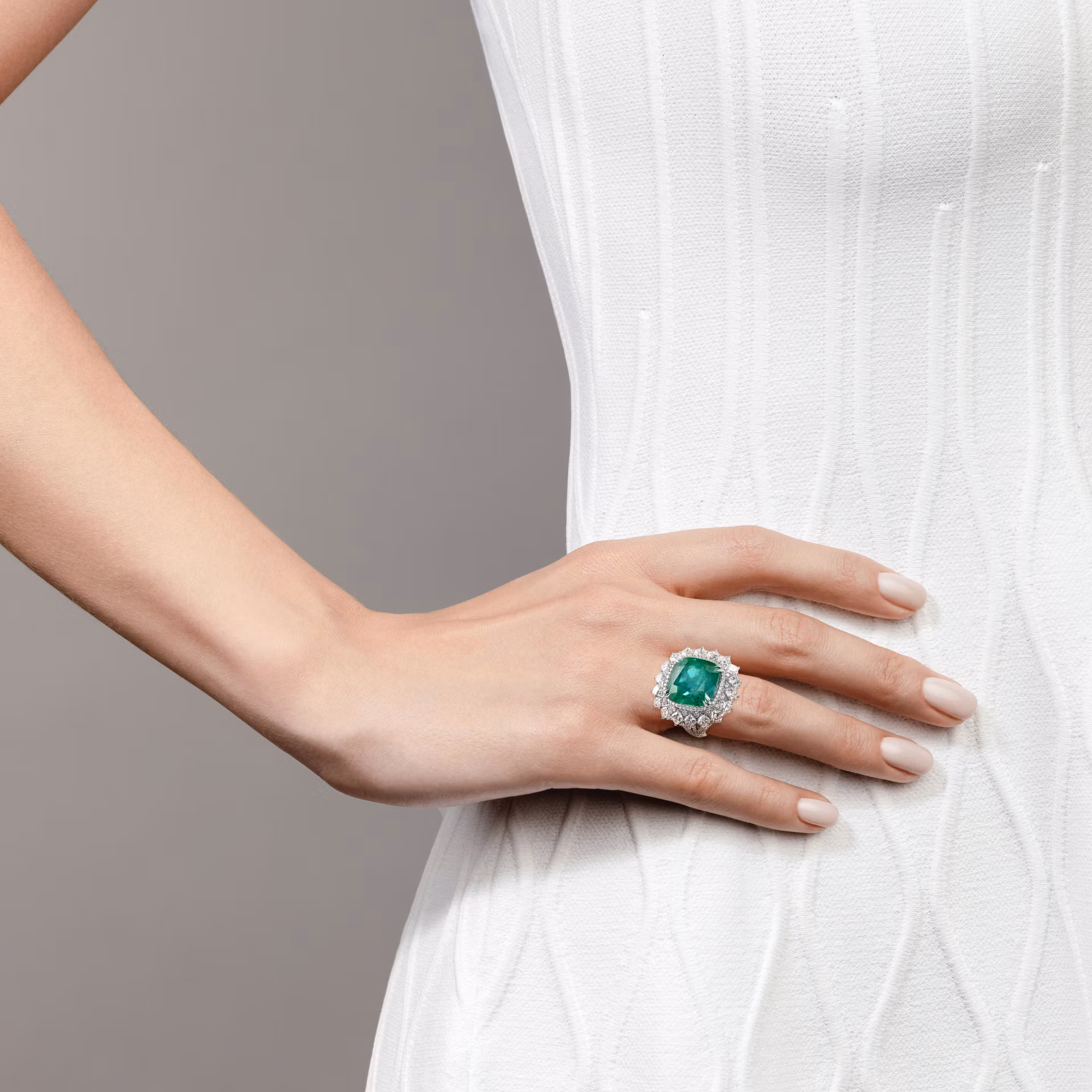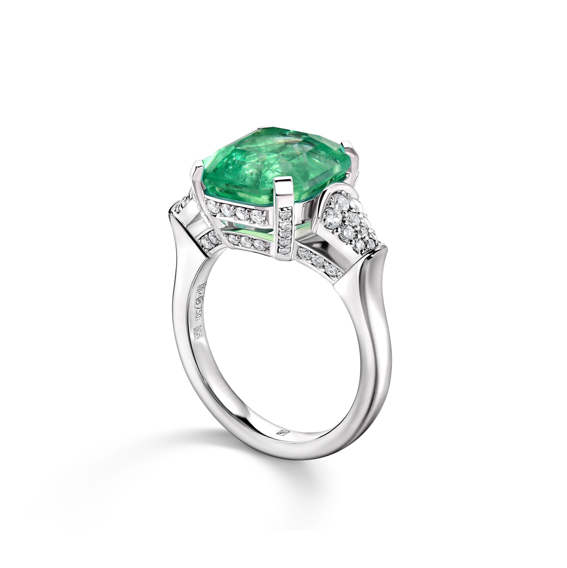 Кольцо от ювелирной дизайн-студии Parure Atelier выполнено из благородного белого золота 750 пробы и украшено ярким изумрудом весом 4.04 карата, ограненным в форме октагона. Центральный камень — это изумруд насыщенного зеленого цвета, который эффектно подчеркивается россыпью боковых бриллиантов весом 0.351 карата. Камни имеют классическую круглую огранку, создавая утонченный контраст с геометрией центрального камня. Белое золото придает украшению современный и элегантный вид, делая его идеальным выбором для ценителей редких и изысканных украшений. Кольцо станет великолепным дополнением как к повседневному, так и к торжественному образу.