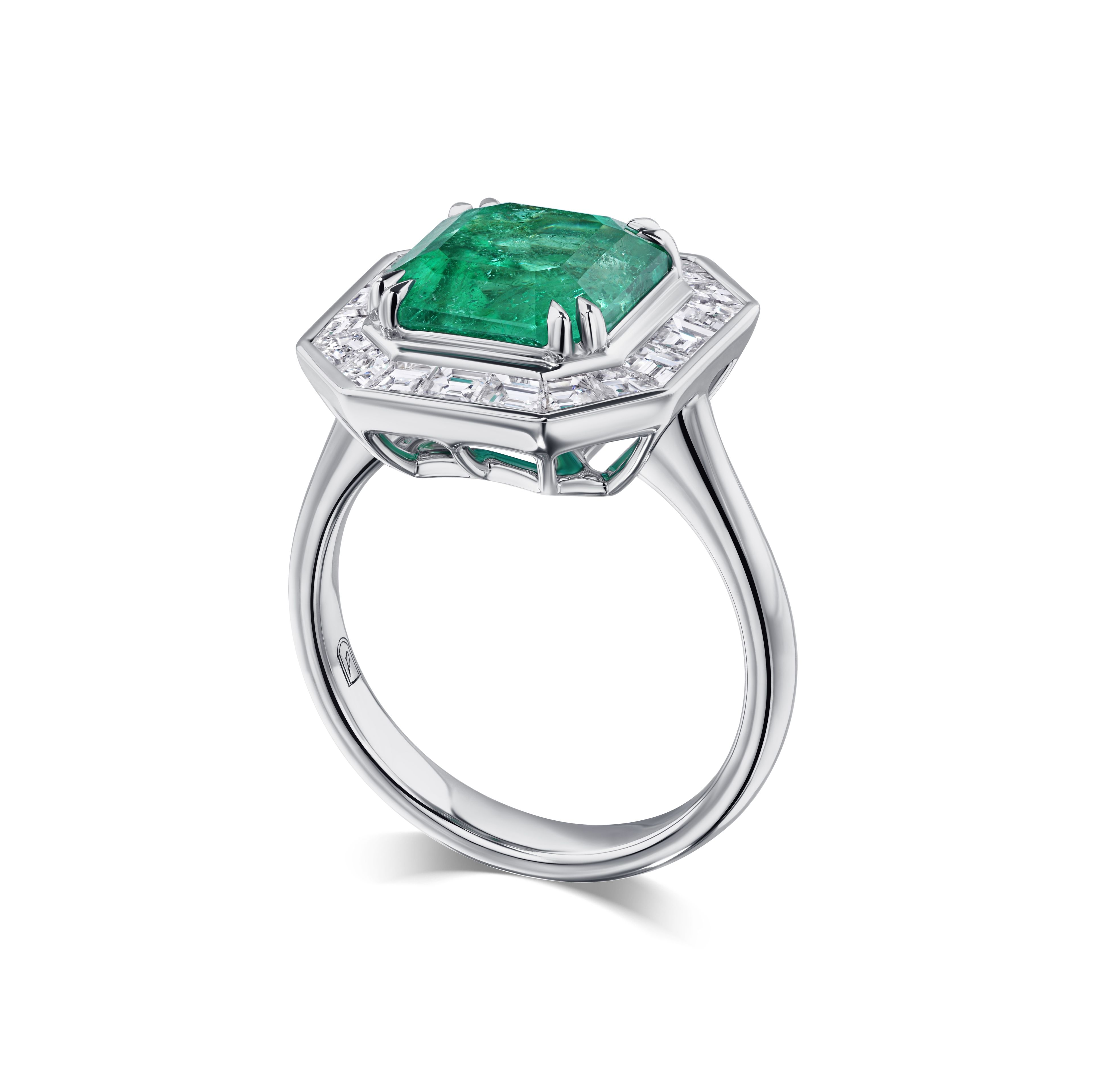 Это кольцо — воплощение элегантности и мастерства. В центре композиции сияет изумруд весом 4.46 карат, который притягивает взгляд своей насыщенной зеленью. Украшение обрамлено бриллиантами огранки Тапер, общий вес которых составляет около 1.16 карат. Их блеск создает впечатляющий контраст с центральным камнем, подчеркивая его природную красоту.