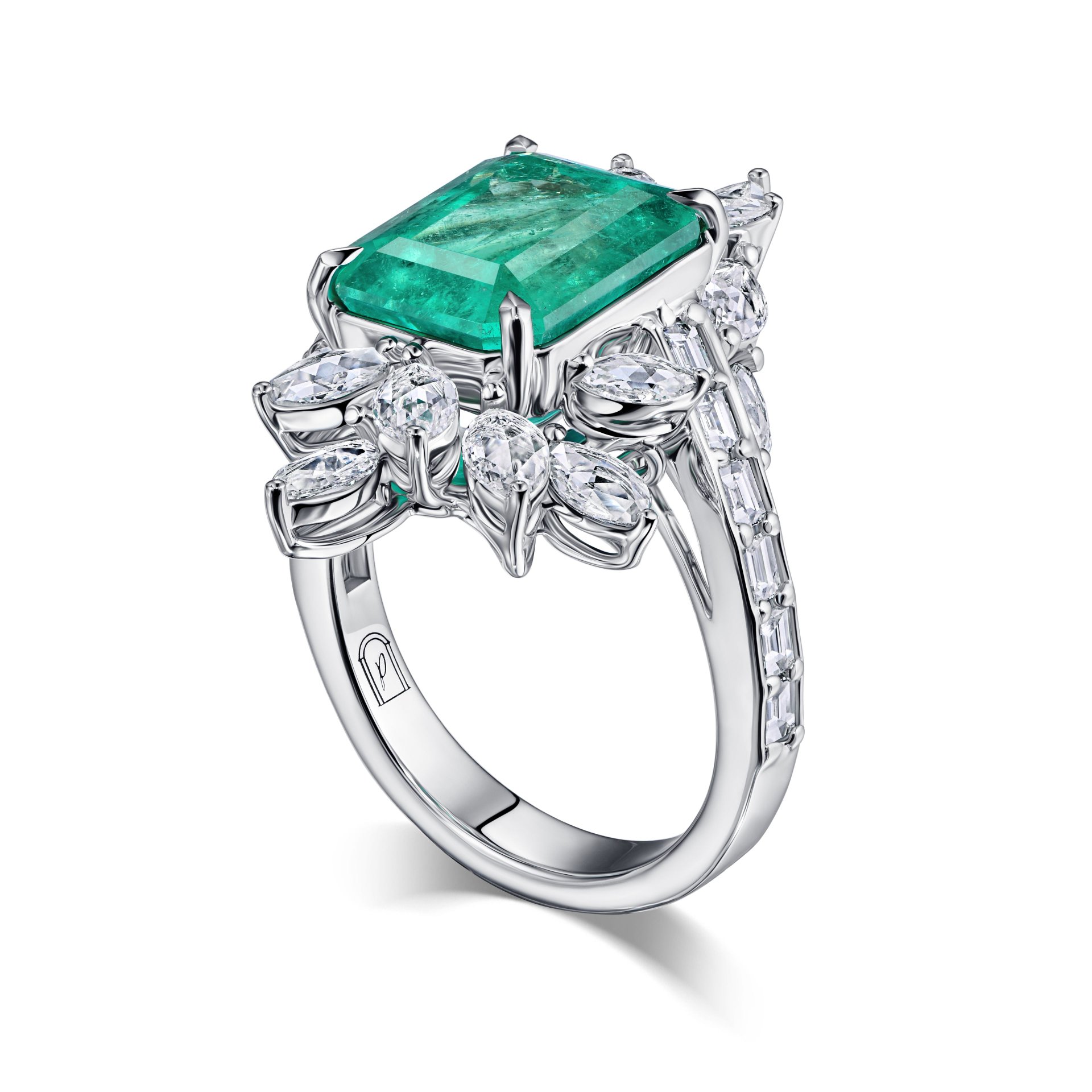 Кольцо с изумрудом 5.08 карата привлекает внимание своим выразительным дизайном и тщательно продуманной композицией. Центральный камень — изумруд весом 5.08 карата, огранённый в прямоугольной форме с чёткими гранями, которые подчёркивают глубину и насыщенность зелёного оттенка. Вокруг изумруда расположены прозрачные вставки, напоминающие лепестки, выполненные в форме маркиз, что создаёт эффект цветочного венка и добавляет изделию лёгкость и изящество.