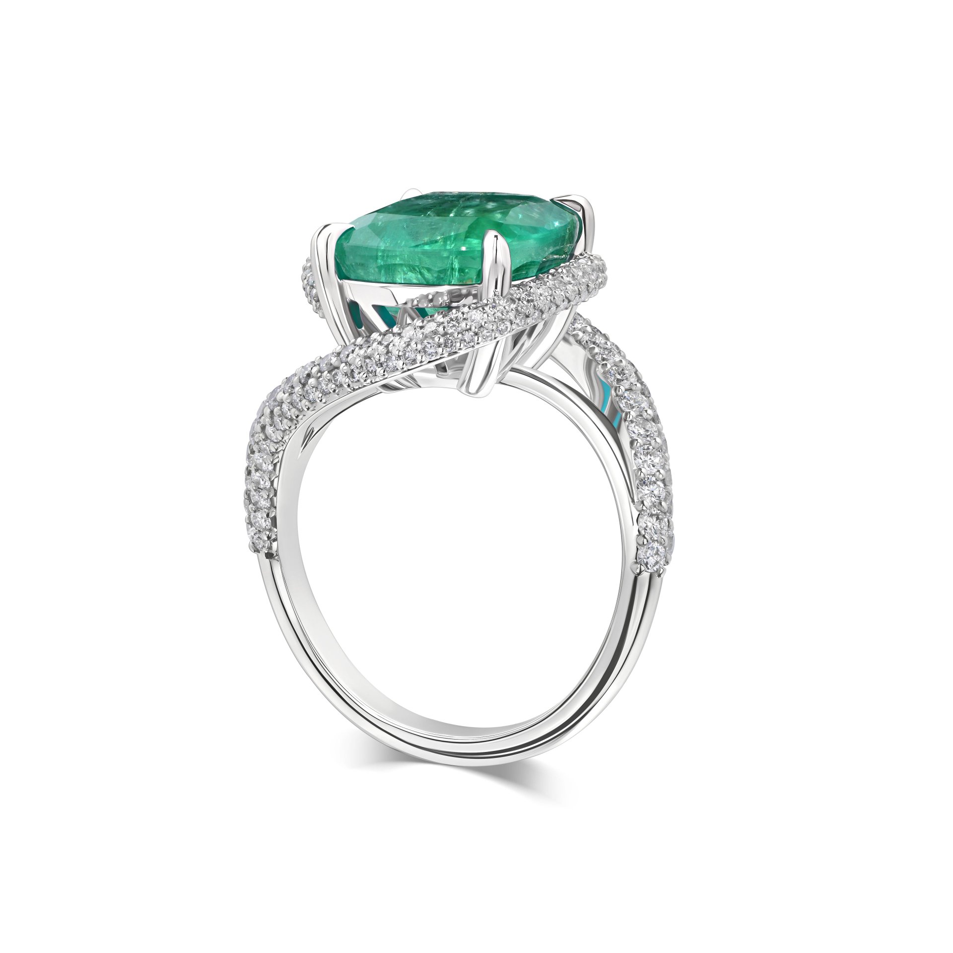Это утонченное кольцо с изумрудом весом 5.50 карат от ювелирной дизайн-студии Parure Atelier воплощает в себе изысканный стиль и непревзойденное мастерство. Центральный камень, изумруд огранки кушон, впечатляет своей глубокой зелёной окраской и чистотой. Кольцо выполнено из белого золота 750 пробы, которое придаёт изделию элегантность и прочность.