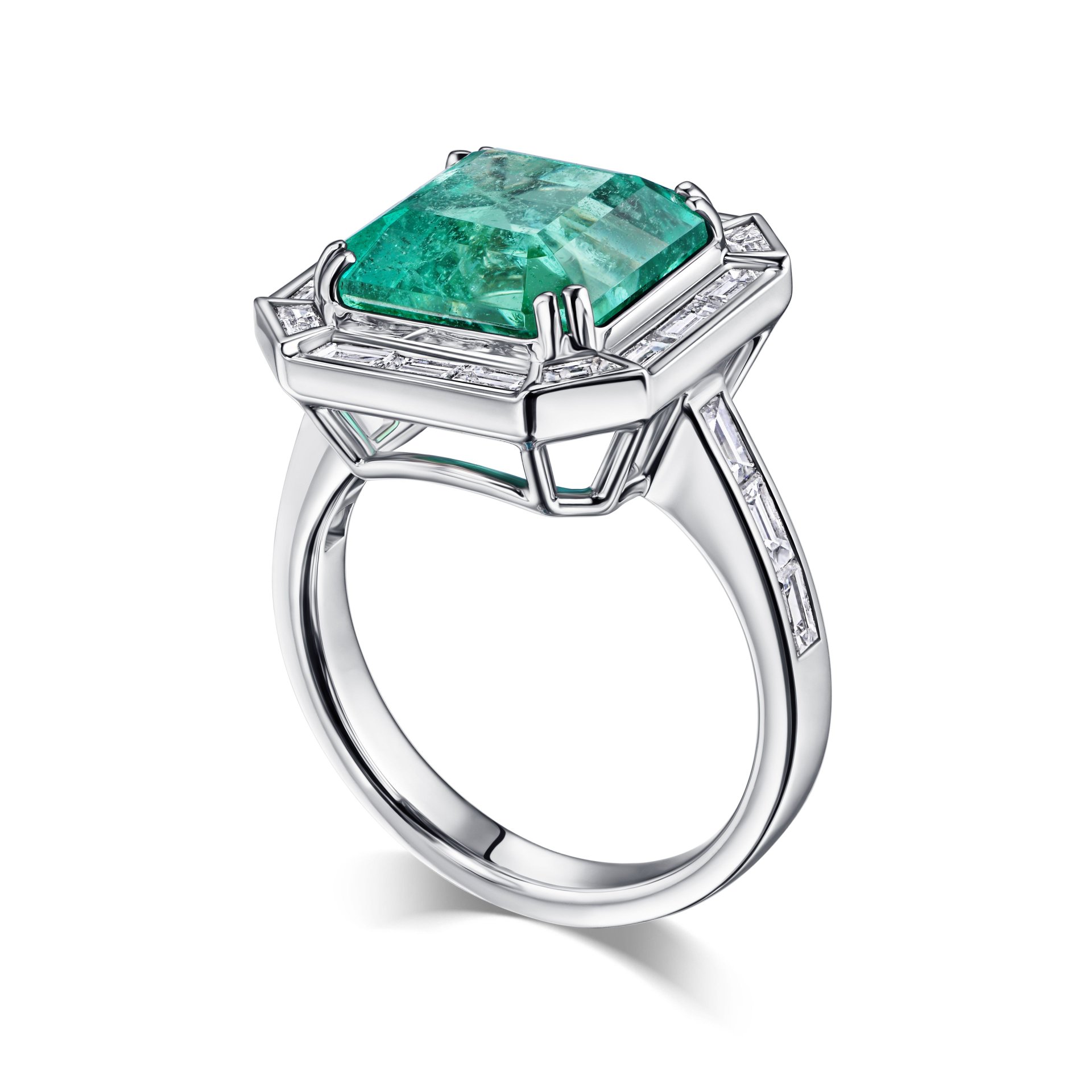 Кольцо с изумрудом 5.90 карата привлекает внимание своим выразительным центральным камнем насыщенного зелёного оттенка. Изумруд весом 5.9 карата выполнен в квадратной огранке, которая подчёркивает глубину цвета и естественную текстуру камня. Вокруг центрального изумруда расположены аккуратные багетные бриллианты, создающие эффект рамки и добавляющие композиции геометрическую чёткость. Белое золото, выбранное в качестве основы, выгодно подчёркивает яркость зелёного камня и прозрачность бриллиантов, придавая украшению современный и сдержанный вид. Благодаря сбалансированному сочетанию форм и материалов, изделие подходит как для особых случаев, так и для повседневного образа. Это украшение — работа ювелирной дизайн-студии Parure Atelier, где внимание к деталям и качество исполнения остаются на первом месте.