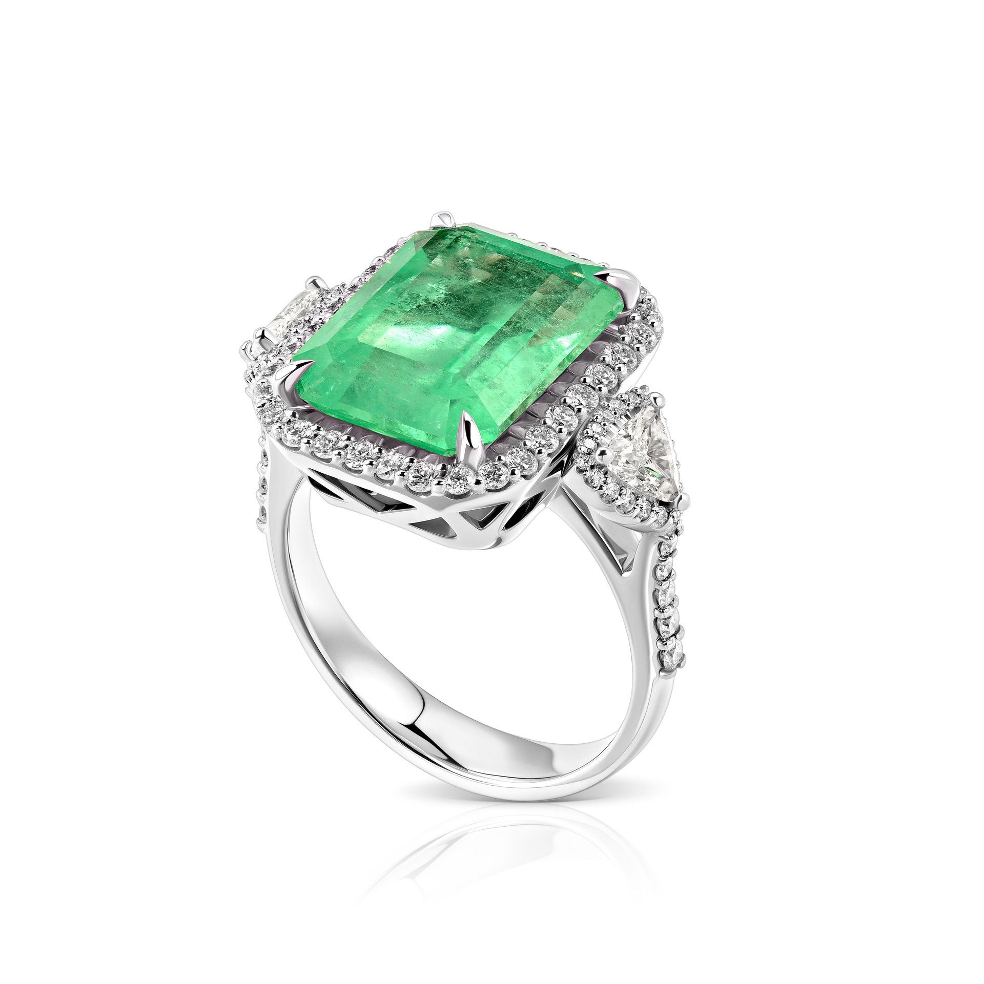 Изумрудное кольцо от Ювелирной дизайн-студии Parure Atelier привлекает внимание своим неповторимым сочетанием благородных материалов и точной работы. В центре композиции расположен изумруд огранки октагон, весом 6.97 карата, который обрамляют два бриллианта триллионной огранки общим весом 0.41 карата. Камни гармонично дополняются россыпью бриллиантов круглой огранки (вес 0.522 карата), которые подчёркивают блеск центрального камня. Изделие выполнено из белого золота 750 пробы, что подчеркивает насыщенный цвет изумруда и создаёт утончённый контраст. Кольцо идеально подходит для особых случаев, придавая элегантность любому образу.