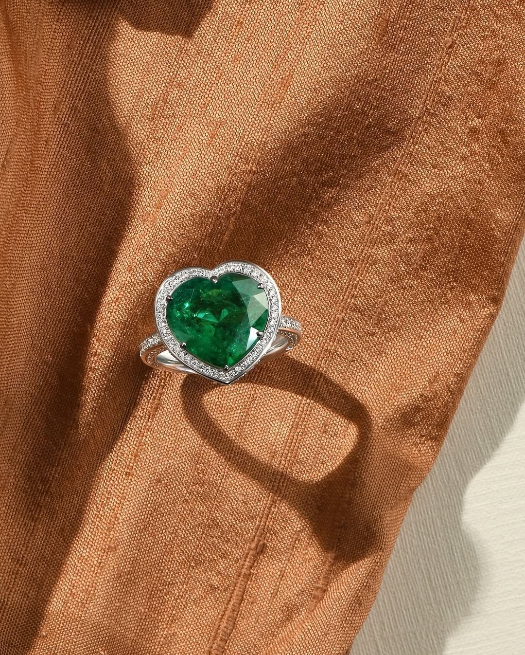 «Кольцо с изумрудом 7.46 карат» — воплощение элегантности и утончённого стиля. Центральный изумруд в форме сердца, весом 7.46 карата, завораживает своей глубокой зеленью, создавая ощущение таинственной роскоши. Он окружён сияющими бриллиантами общей массой около 0.95 карата, которые подчёркивают его природную красоту и придают кольцу неповторимое сияние.