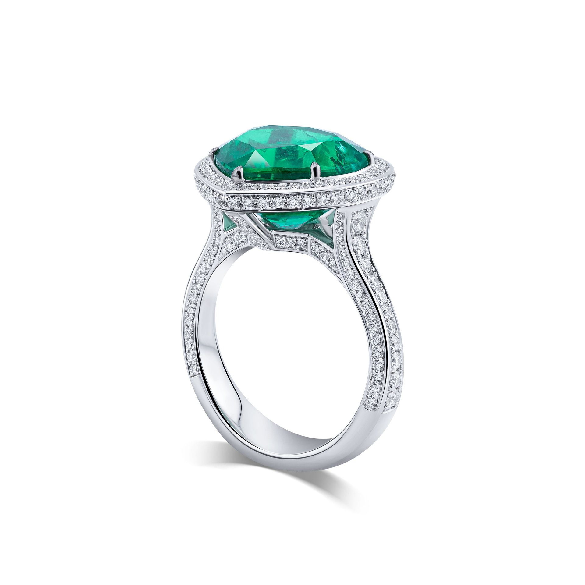 Белое золото, из которого изготовлено украшение, идеально дополняет композицию, создавая гармоничный контраст с насыщенным цветом изумруда. Каждый элемент кольца тщательно продуман и выполнен с высочайшим мастерством, что делает его настоящим произведением искусства.
