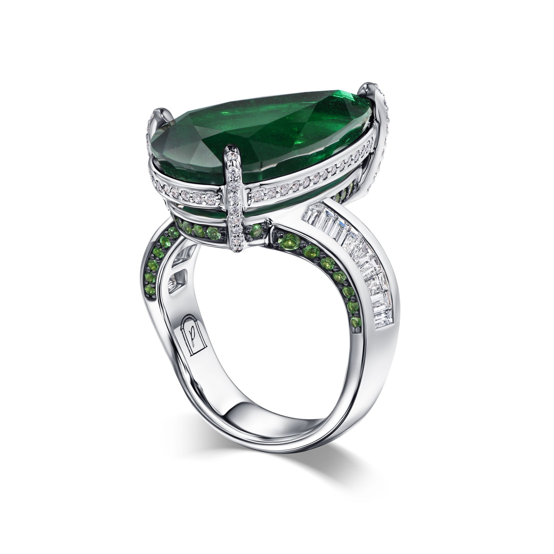 Кольцо с изумрудом 9.34 карата привлекает внимание крупным центральным камнем в форме капли, который занимает основное пространство украшения. Глубокий зелёный оттенок изумруда подчёркивает его естественную красоту и уникальность. По бокам расположены аккуратные дорожки из мелких бриллиантов, выполненные в огранке багет, которые гармонично дополняют дизайн и придают изделию дополнительную выразительность. Металл белого золота служит элегантной основой, создавая контраст и подчеркивая насыщенность цвета центрального камня. Такая композиция делает кольцо универсальным украшением, подходящим как для особых случаев, так и для ежедневного ношения. Это изделие — результат работы ювелирной дизайн-студии Parure Atelier, где внимание к деталям и качество исполнения остаются приоритетом.