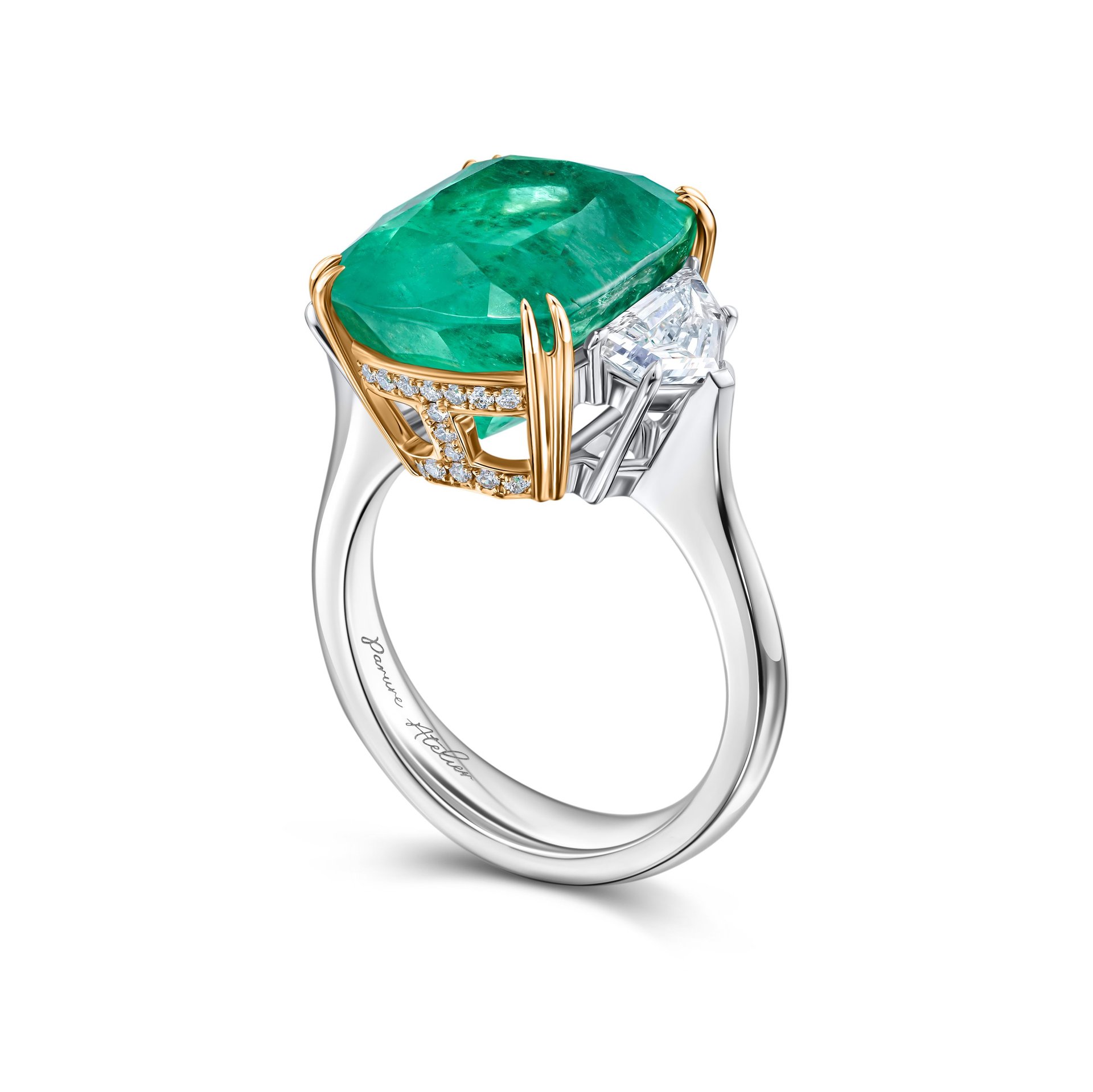 Изумрудное великолепие раскрывается в этом кольце, где центральный камень весом 9.50 карата притягивает взгляд своей глубокой зеленью. Белое золото обрамляет изумруд, создавая гармоничный контраст, который подчеркивает его природную красоту. Боковые бриллианты добавляют изысканности, играя на свету и усиливая сияние главного камня.