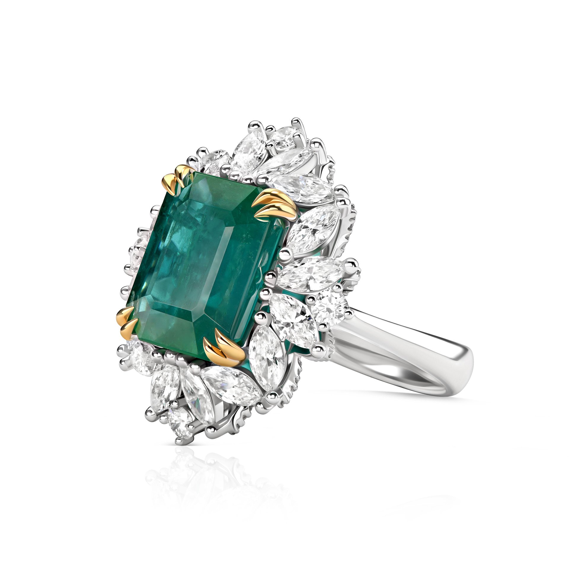 Артикул: R2984-1Кольцо Primavera с изумрудом 5.95 карата в огранке октагон привлекает внимание своей выразительной формой и насыщенным цветом центрального камня. Изумруд занимает ключевое место в композиции, его глубокий зеленый оттенок выгодно оттеняется белым золотом, создавая гармоничный контраст. Вокруг центрального камня расположены аккуратные бриллианты в форме маркиз и круглой огранки, которые подчеркивают геометрию изумруда и добавляют изделию дополнительную игру света. Крепления выполнены с использованием желтого золота, что придает дизайну особую детализацию и изысканность. Такая модель сочетает классические элементы и современный подход к форме, что делает украшение универсальным для различных образов и случаев.