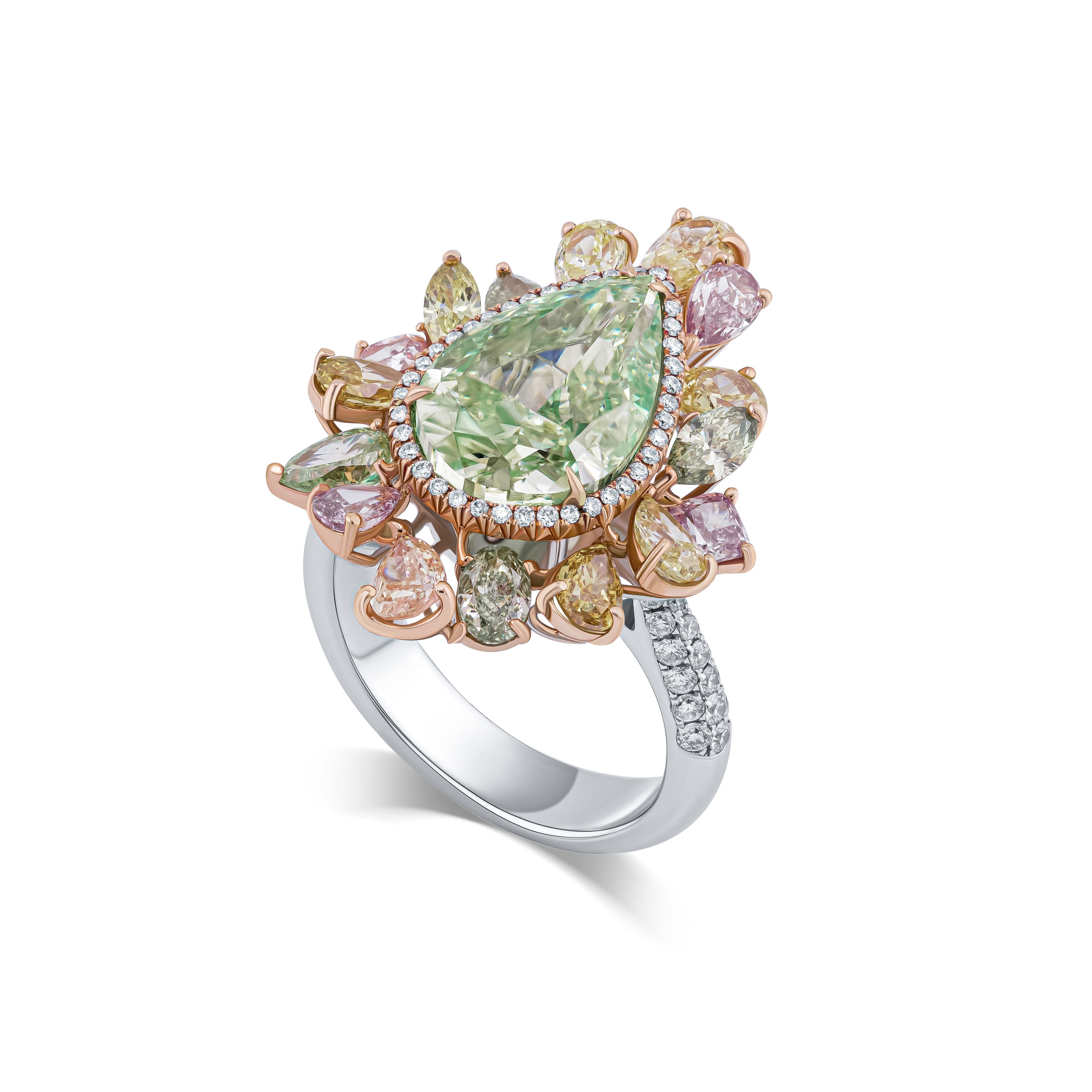 Кольцо-трансформер с зеленым бриллиантом 6.03 карата представляет собой изящное сочетание оригинального дизайна и высокого ювелирного мастерства. Центральный камень — зеленый бриллиант весом 6.03 карата — отличается редким оттенком и выразительной огранкой в форме груши, что придает украшению особую глубину и игру света. Вокруг основного камня расположены разнообразные цветные бриллианты различных огранок, которые создают эффект живого цветочного мотива и подчеркивают естественную красоту зеленого центра.
