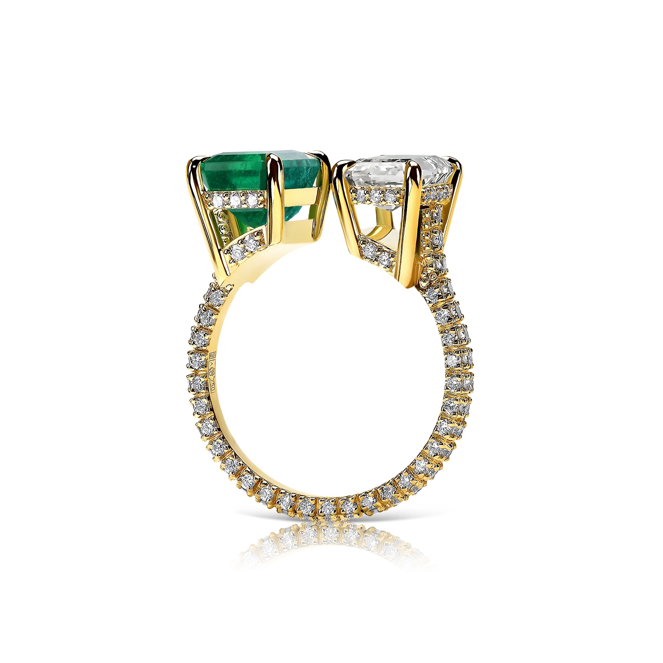 Вдохновленное природной гармонией и элегантностью, это кольцо сочетает в себе два впечатляющих камня — изумруд весом 2.48 карата и бриллиант в 1.00 карат. Изумруд, сияющий глубоким зелёным оттенком, притягивает взгляд своей загадочной красотой. Его оттенок прекрасно дополняется чистым блеском бриллианта, который добавляет композиции яркости и света. Каждый камень закреплён в изящной оправе из жёлтого золота, что подчеркивает их природное великолепие и придаёт украшению теплый, солнечный оттенок.