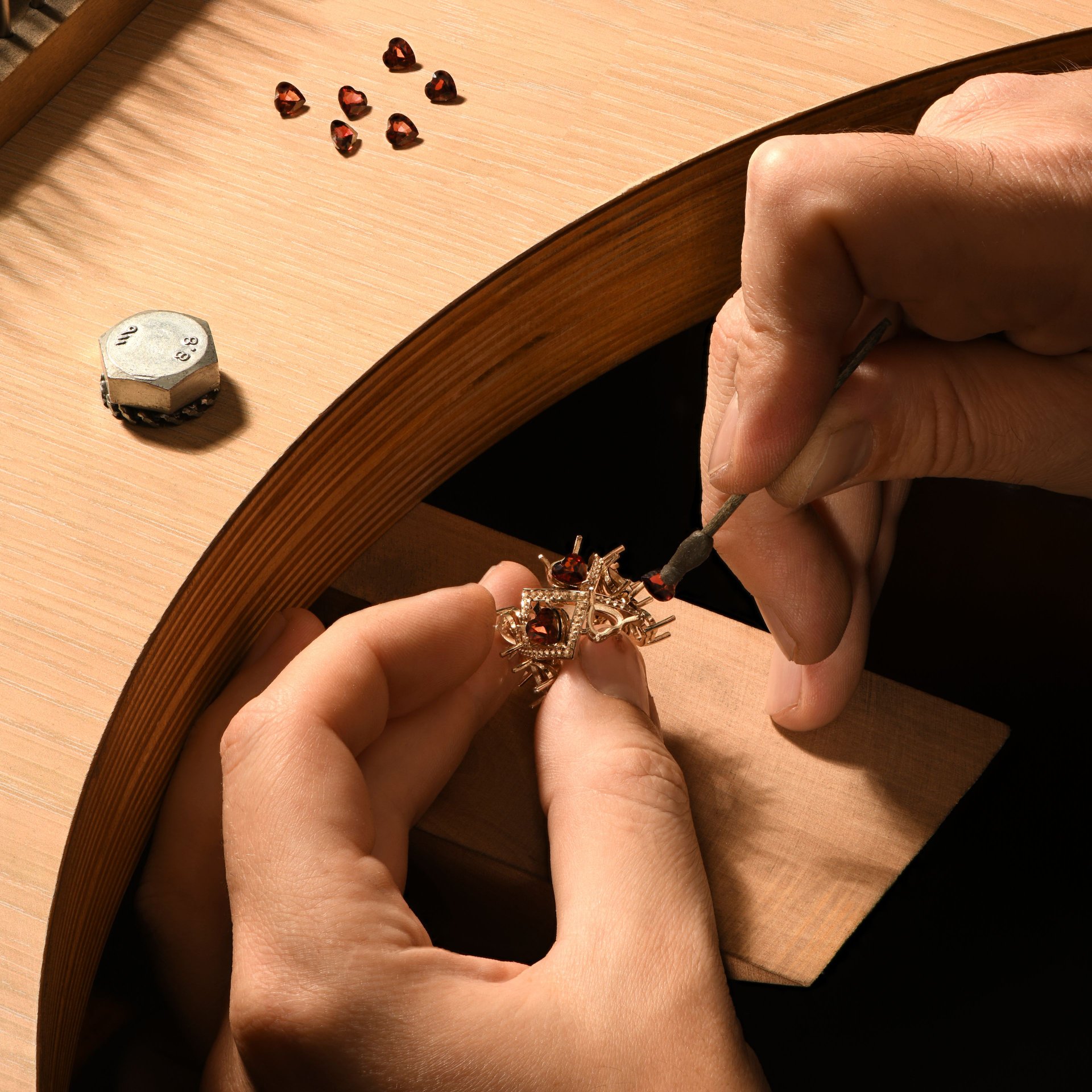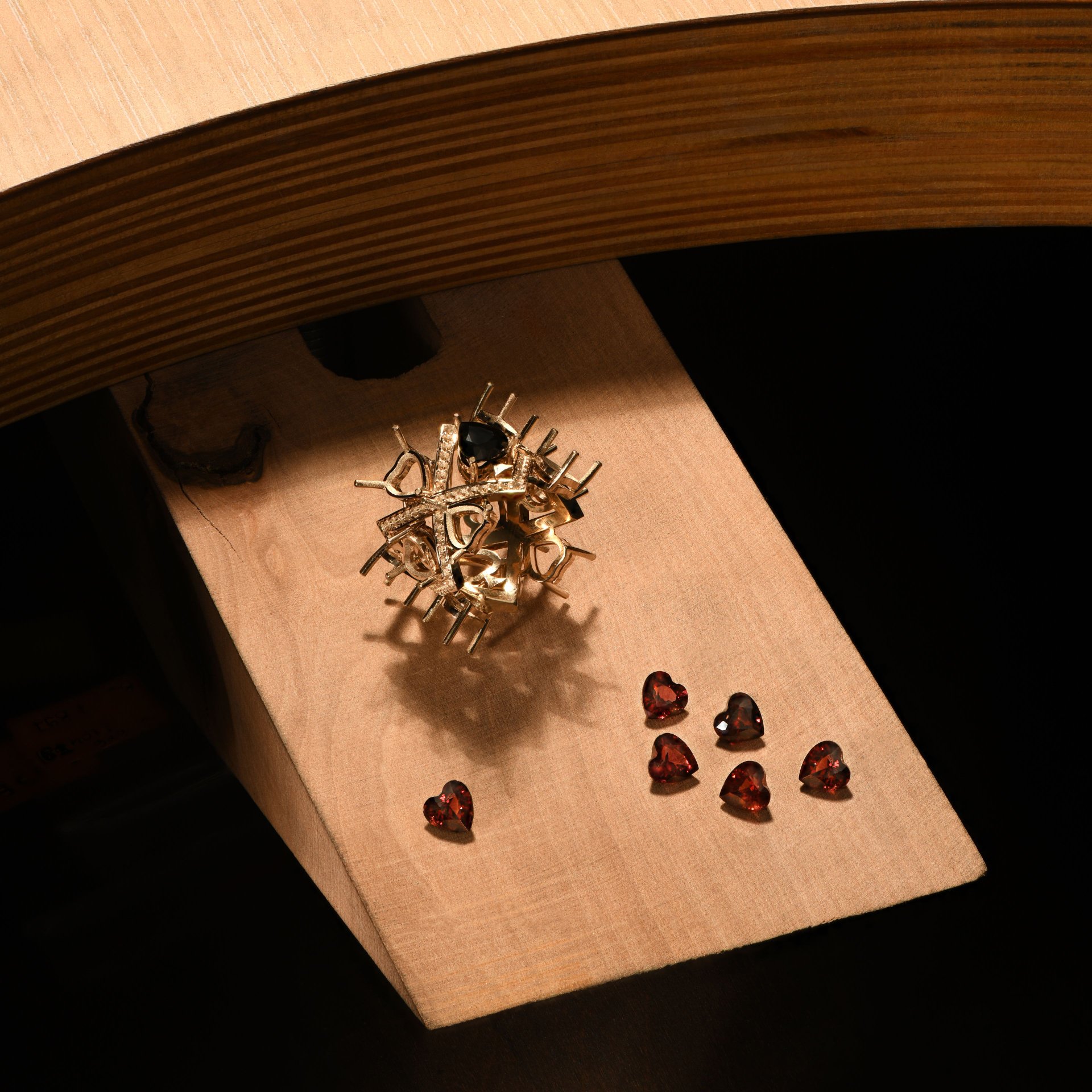 Кольцо «Сердца» — это воплощение страсти и изысканности, созданное в ювелирной дизайн-студии Parure Atelier. В центре композиции ярко сияют шпинель и гранат, общий вес которых составляет 7.897 карата. Эти камни, подобно огненным сердцам, символизируют силу и глубину чувств. Белое золото обрамляет их, подчеркивая насыщенность оттенков и придавая украшению современный вид.