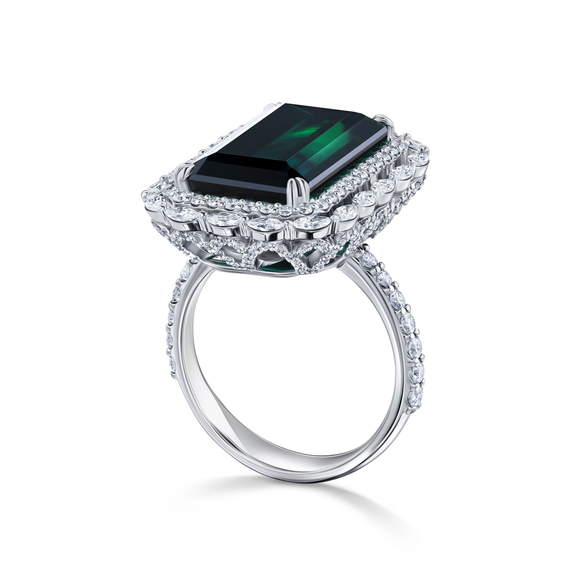 Великолепие кольца «Кольцо с турмалином индиголитом 10.65 карат» проявляется в каждой его грани. Центральный камень — турмалин индиголит весом 10.65 карата — завораживает глубоким сине-зеленым оттенком, который словно переносит в мир морских глубин. Камень обрамлен изящной россыпью бриллиантов, придающих украшению дополнительное сияние и утонченность.