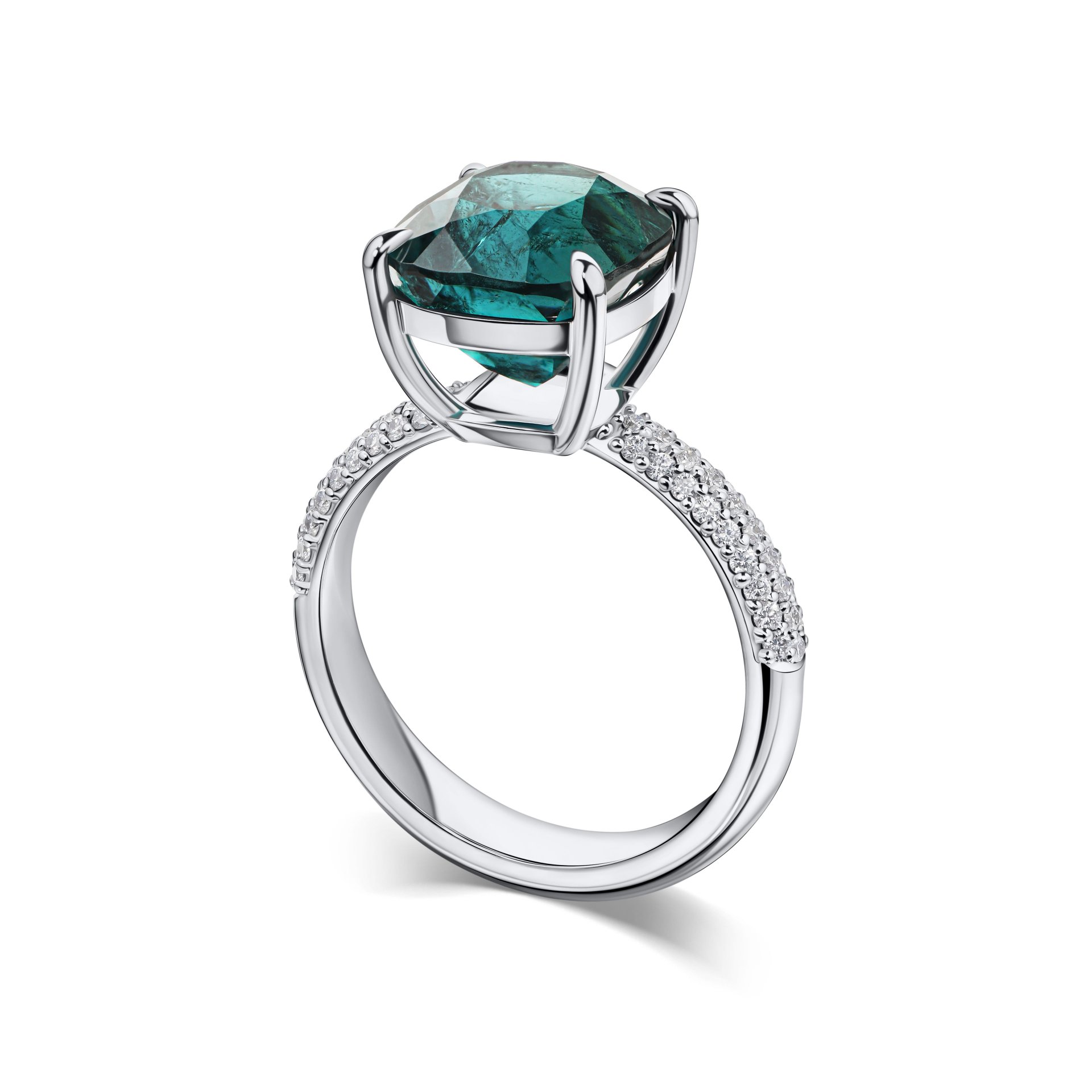 Кольцо с турмалином индиголитом 5.07 карат — это воплощение утончённой элегантности и современного дизайна. Центральный камень насыщенного синего оттенка, весом 5.07 карата, завораживает своей глубиной и игрой света. Его исключительная огранка подчёркивает природную красоту и уникальность турмалина, привлекая внимание и вызывая восхищение.