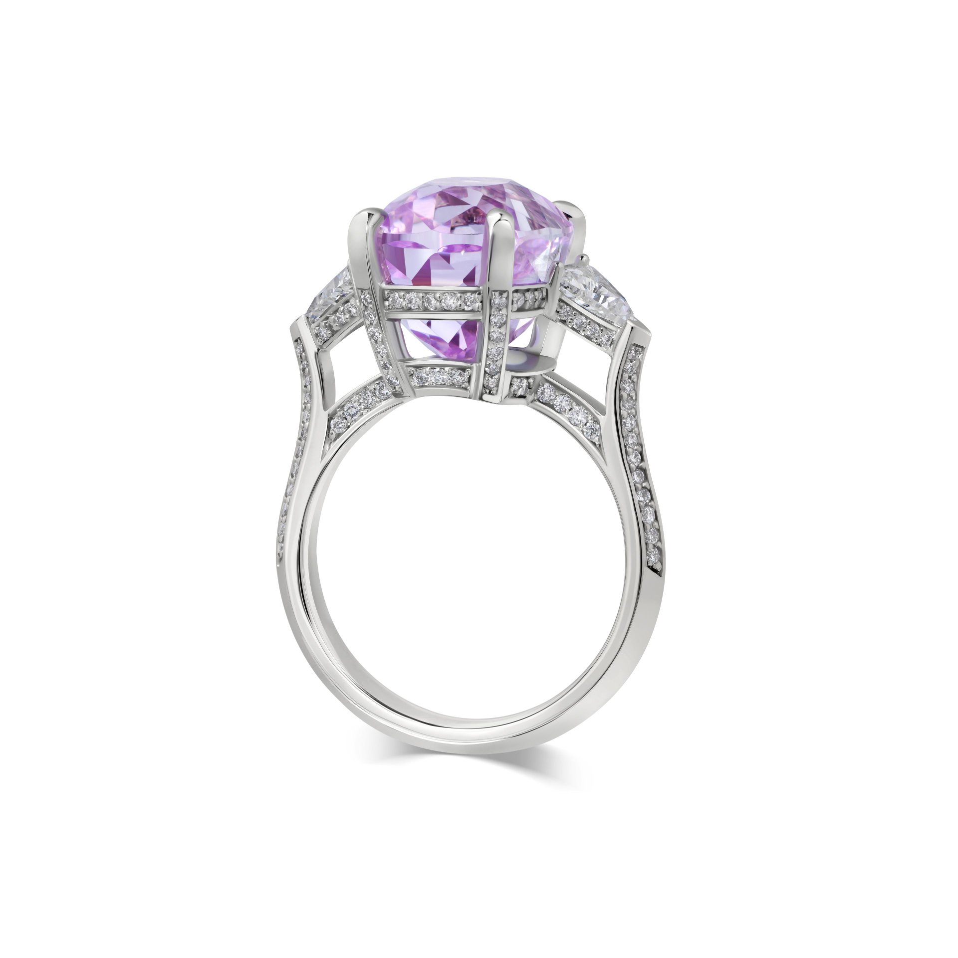 Кольцо с кунцитом от ювелирной дизайн-студии Parure Atelier – это воплощение элегантности и утонченности. Центральным элементом является кунцит весом 11.17 карат с огранкой кушон, который притягивает взгляды своим нежным сиреневым оттенком и изысканным блеском. Обрамляющие его боковые бриллианты триллионной огранки (0.69 карат) добавляют дополнительный шарм и сияние, подчёркивая красоту основного камня. Изделие выполнено из белого золота 750 пробы, что обеспечивает его долговечность и превосходное качество. Это кольцо станет идеальным выбором для ценителей уникальных ювелирных изделий, подчеркивающих индивидуальность и стиль своего владельца.