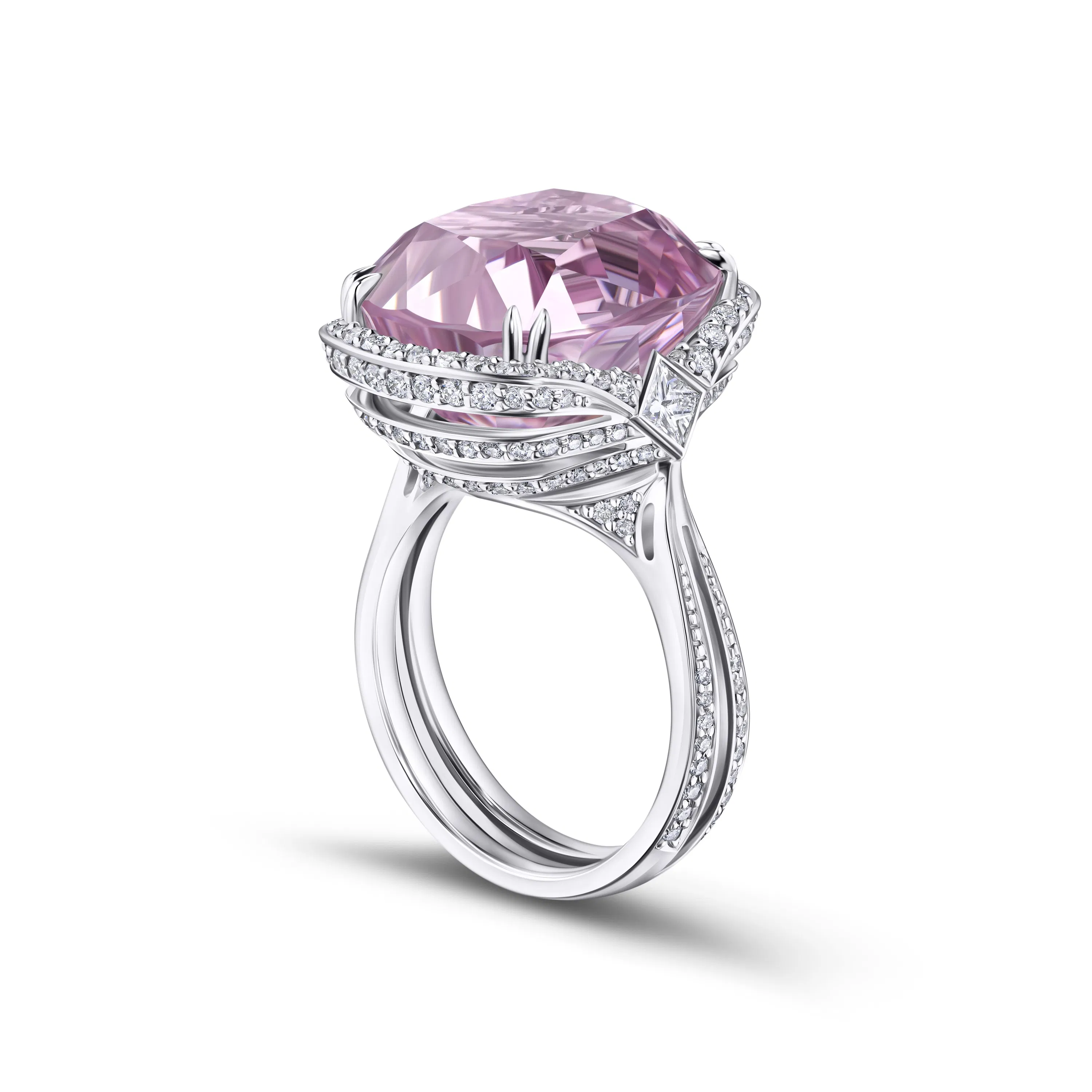 Кольцо с кунцитом 14.69 карат привлекает внимание благодаря крупному центральному камню насыщенного лавандового оттенка. Кунцит, известный своей редкостью и мягкой игрой цвета, занимает в этом украшении ключевое место, создавая основу для сдержанного, но выразительного образа. Окружение из аккуратных бриллиантов подчеркивает форму камня, добавляя легкий блеск и визуальный контраст, который усиливает глубину оттенка.