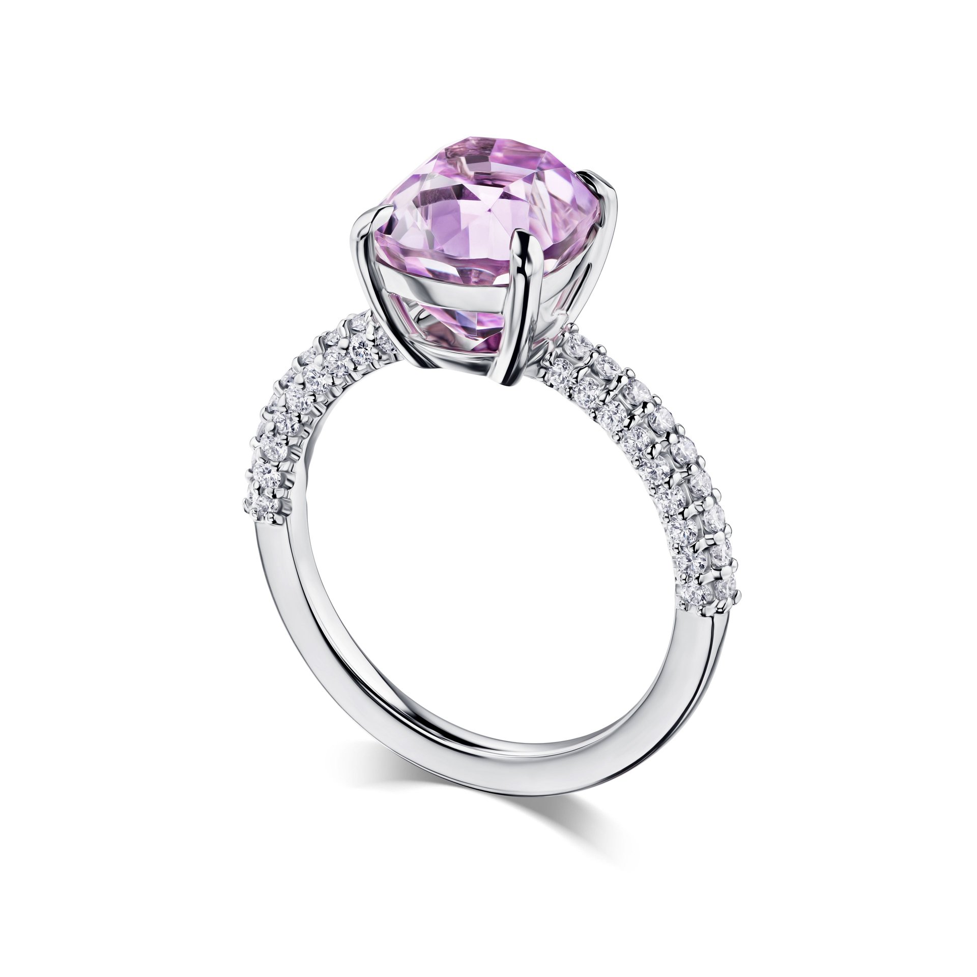 Кольцо с кунцитом 3.72 карата — это воплощение утончённой элегантности. Центральный камень, нежно-розовый кунцит, привлекает внимание своей изысканной прозрачностью и мягкими оттенками. Его вес в 3.72 карата подчёркивает значимость и выразительность изделия. Белое золото, из которого выполнена оправа, создаёт идеальный фон для сияния камня, добавляя украшению утончённости и благородства.